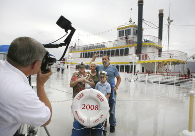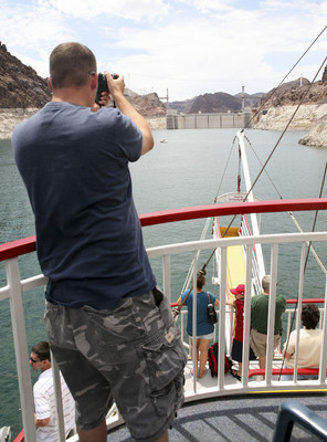 On the outdoor promenade, other tour-goers unwind to the vessel's calm, steady rhythms while seated on blue plastic chairs, which on this summer scorcher really heat the ol' heinie. Soon, Hoover Dam swings into view. "We saw the movie 'Vegas Vacation' years ago, so at least we knew Hoover Dam was here, and we wanted to make sure we saw it," says Steve Harrison, visiting from Cedar Rapids, Iowa, with his wife, Theresa, on their inaugural Vegas vacation. "We didn't come here for the casinos because we have children with us," she says. "No gambling, so this is wonderful."
