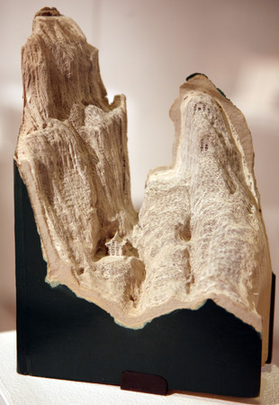 Geography impressively rises out of books used by Guy Laramee, who builds grand landscapes of mountains, cliffs and boulders, the sculptures ascending from the pages of an illustrated history of Japan and a massive French dictionary. "They manifest an illusion of exotic geographic worlds," Laramee says in his statement. "We live in books, literally. We stack them, and we carve ourselves little niches inside them."