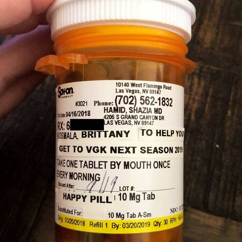 These “pills” are, in fact, jellybeans in a pill bottle. The actual prescription label has been adjusted to read, “TO HELP YOU GET TO VGK NEXT SEASON 2019.” The directions are to take one, every morning, until the 2018-19 season opener.
