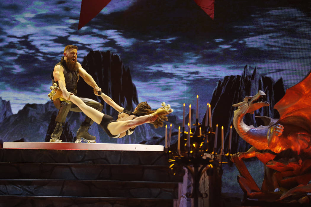 Spinning with great velocity on a round stage just 9 feet in diameter, Billy and Emily performed a s“Game of Thrones”-inspired routine. A fire-belching dragon flew by and billowing bursts of flames added extra drama as they spun some 20 feet above the show’s four judges.