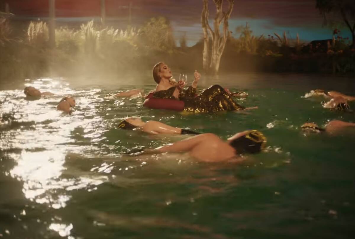 The scene then turns to an Esther Williams-style water number. A classic overhead shot shows a dozen artists, ringing the singer as she sings, “So I’m trying to get over myself/Stop trying to be somebody else.”