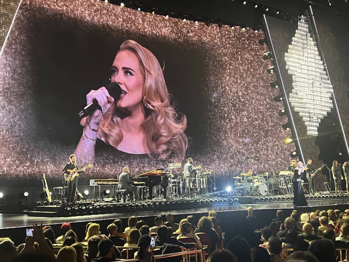 Her voice wavering, Adele spoke about the delay late in the show, as several Caesars Entertainment officials — including company head Anthony Carano — were seated in the VIP booths. She is clearly happy to play Las Vegas, or as she said, “I’m playing (expletive) Las Vegas,” as the crowd cheered.