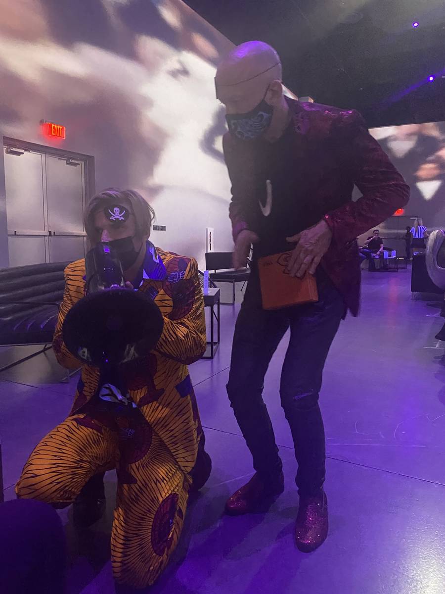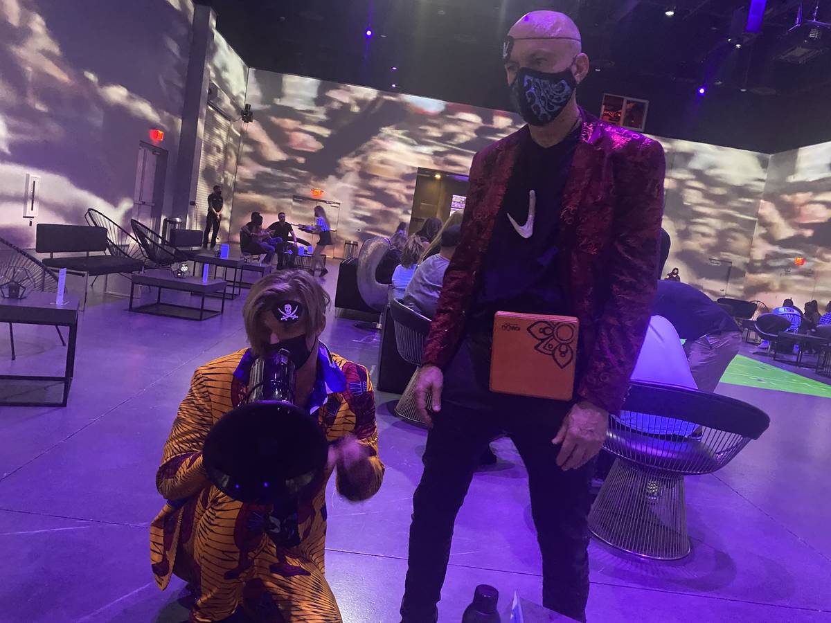 The director of content and cool “stuff” for Area15 and co-founder of Blue Man Group arrived at the arts-and-entertainment complex in a full Las Vegas Raider costume.