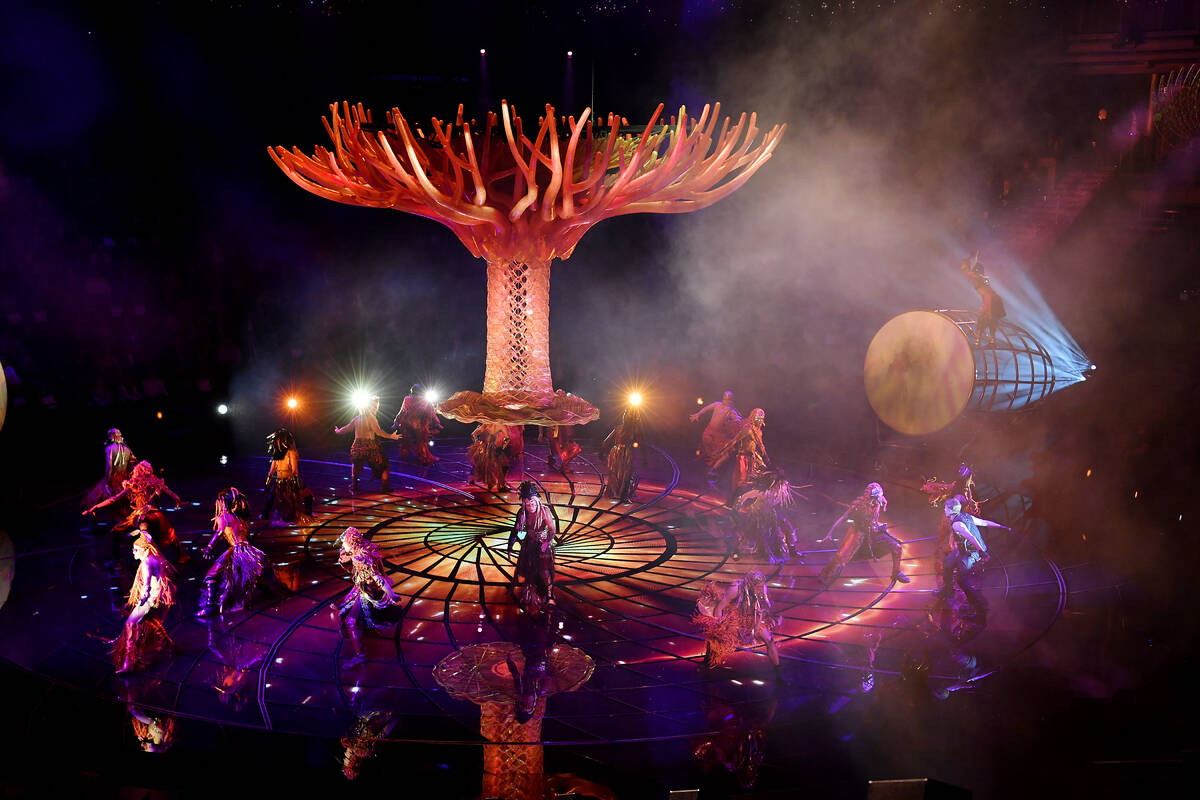 Another scene throws anyone who saw “Le Reve.” Producers have made it clear that “Awakening” is not a water production, the theater’s lake stage drained as the show closed. But there is an aquatic effect, the Water Realm, that feels as if the entire theater is submerged.