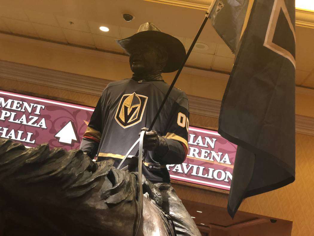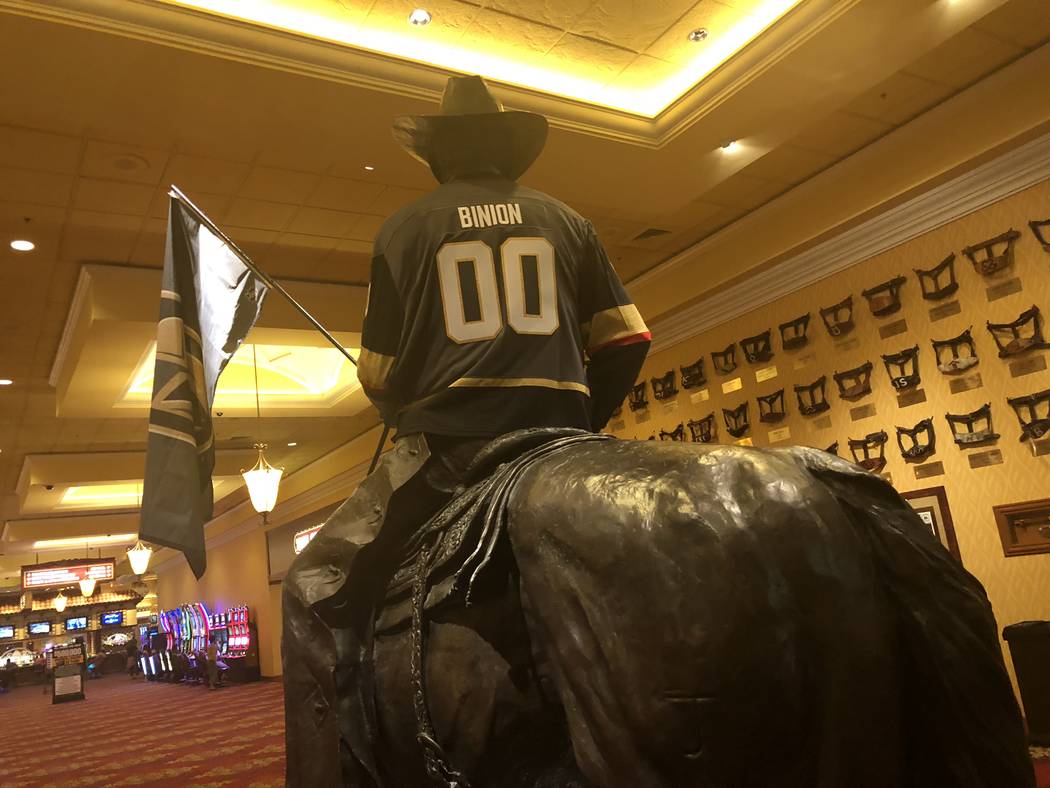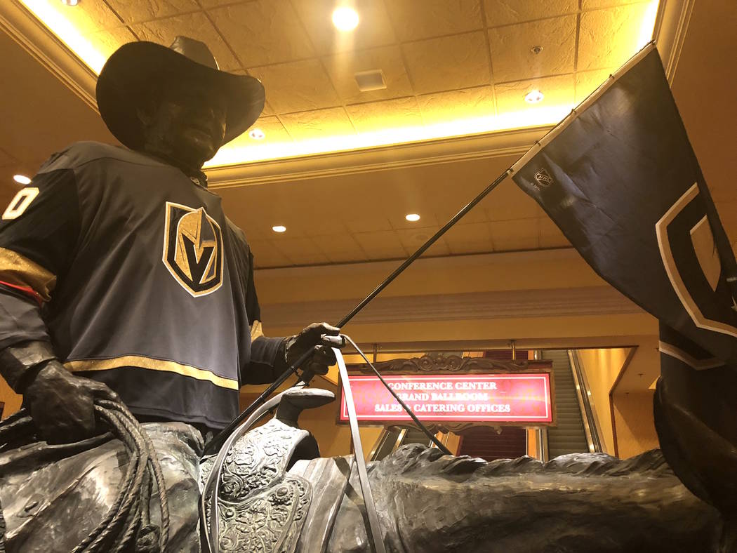 The familiar statue of Binion riding tall in the saddle at South Point hotel-casino was dressed for the Stanley Cup Finals on Tuesday. You can find oversized Benny, also wielding a Golden Knights flag, on the walkway leading to the South Point Arena & Equestrian Center.