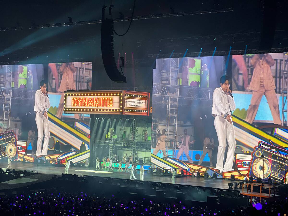 But the band is so visually dynamic, sound is often a secondary concern. The crowd rejoiced through their hits “Dynamite” and “Butter,” songs currently blasting from the Bellagio Fountains shos. The former was set in a nighclub scene, with the guys dealing classic disco moves. scene overlooking the stage. The latter was played to a stage of pulsating, golden checkerboard squares.
