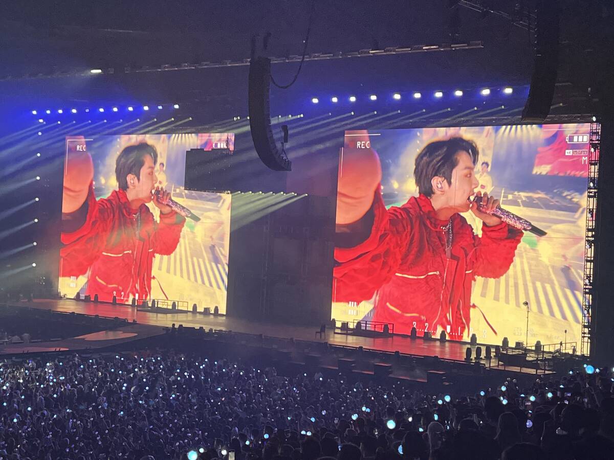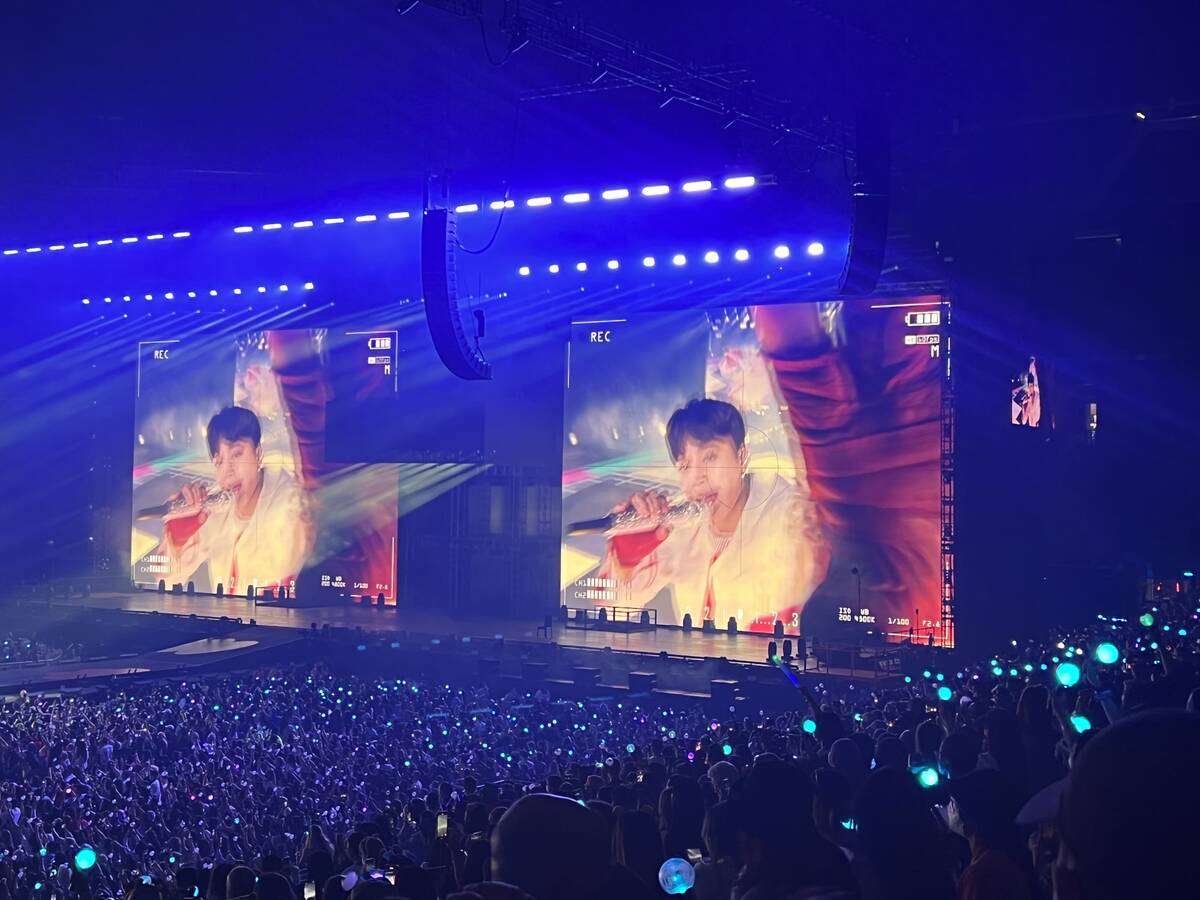 Of course, both of those thoughts were blown out by so much purple noise. Ever hear phrases like, “The din of a jet engine, right next to your head?” That applies to a BTS show. “Permission To Dance” could easily be called “Permission To Shriek.” It’s a scream-scape for the approximately 40,000 fans at the first of four sold-out shows at Allegiant.