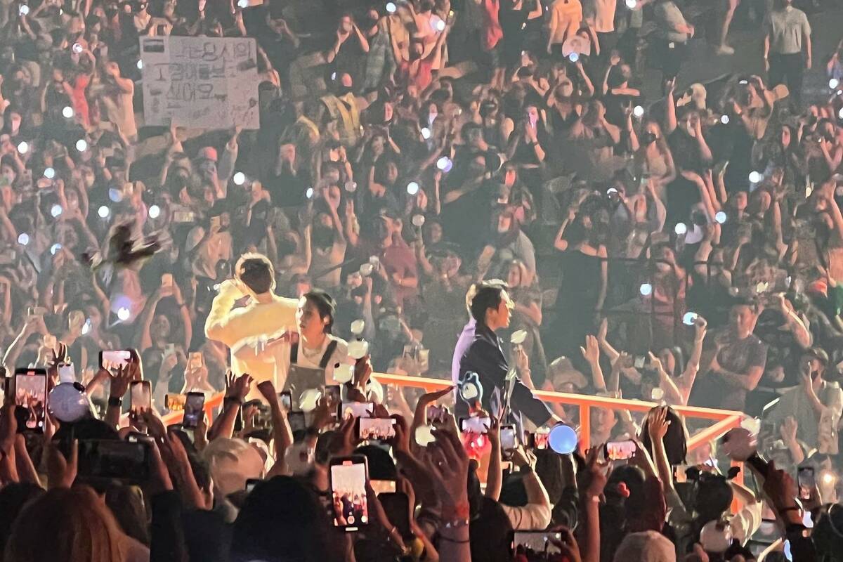 A lighted runway stretches to a square stage in the center of the venue. BTS is reportedly worth $100 million and spends lavishly on its stage set, which is the scale of The Rolling Stones and shows that have also rumbled through Allegiant Stadium.