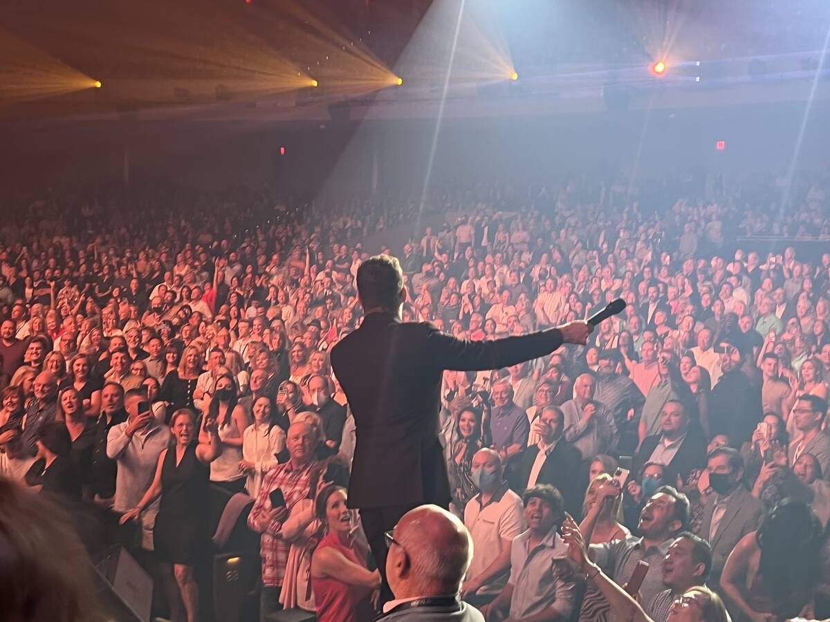 Bublé makes a unique decision to split his stage between the guys and the women players, strings on house left, music director Nick Jacobson-Larson and the traveling horn section/rhythm section on the right. The staging looks like an old “Snowball” roller-skate arrangement (look it up). But like everything else Bublé puts onstage, it works.
