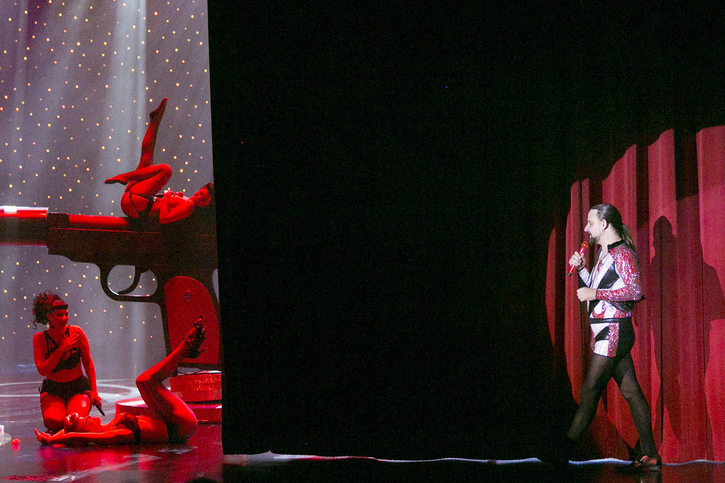 Sweets was backed by a lineup of friends and fellow Burlesque performers Bettina May, Kitten LaRue, Elektra Cute and Miss Miranda. Their performance was spot-on, as captivating as their various stage names. A stream of flowers was pulled from the gun’s muzzle to cap the number, a peaceful message that brought huge response from the sold-out crowd.