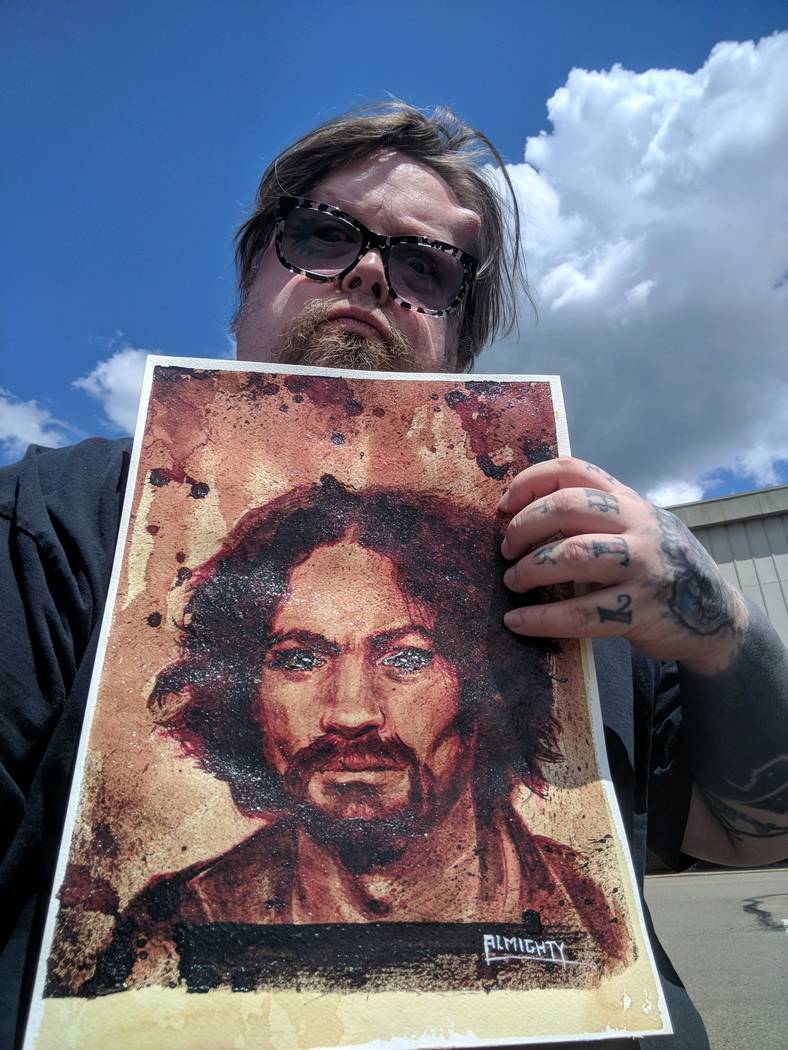Bagans is certain of the authenticity of the materials used in the painting — specifically Manson’s remains — as his production company is developing a documentary about the serial killer’s life. Bagans has been working with Manson’s grandson, Jason Freeman, who won a legal tussle over possession of Manson’s body and organized the late serial killer’s memorial service.