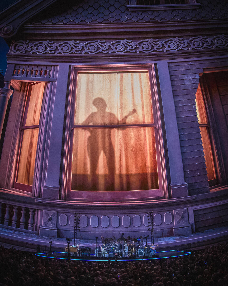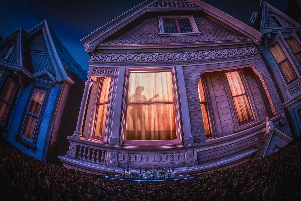 Held over is the show’s signature opening segment, in which the virtual camera pulls back from a tight view of a row of Victorian houses in San Francisco’s Haight Ashbury district, dating to the band’s infancy. The shot moves out, up, rising through clouds, into the borders of the universe, it seems. “Shakedown Street” is the number. We would not be surprised to see William Shatner in this starry trek, or even the ghost of Bill Walton.