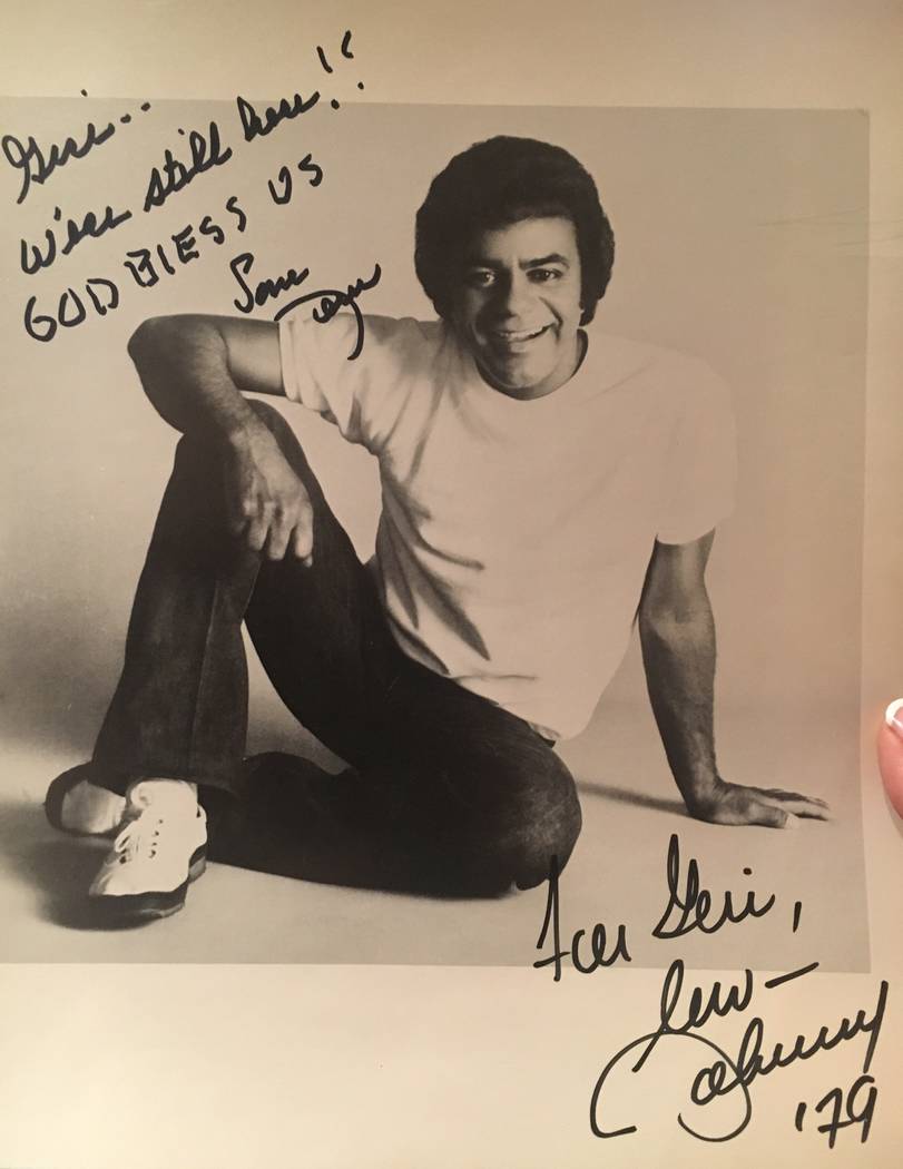 Vegas violinist Geri Thompson has two Johnny Mathis autographs. On the same photo. Forty years apart.