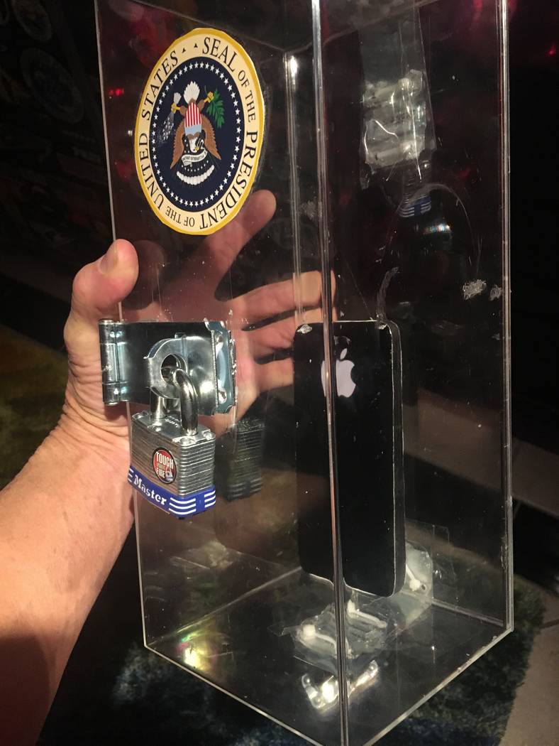 Carrot Top (real name Scott Thompson) unveiled his latest bit Friday night, and this might be the top of the props: The President Trump Phone Case. This an iPhone locked inside a plexiglass box stamped with the presidential seal. As Carrot Top said after Friday’s show, “It killed.” Unlike some other news-pegged props (such as the Balloon Boy effect from 2009), this one will stick around a while …