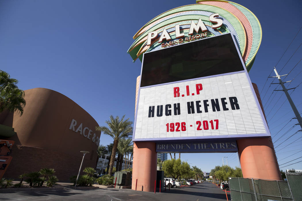The Palms hotel-casino marquee memorializes Playboy Magazine founder Hugh Hefner on Thursday, Sept. 28, 2017, in Las Vegas. Hefner died of natural causes at his home on Wednesday at the age of 91. Richard Brian Las Vegas Review-Journal @vegasphotograph
