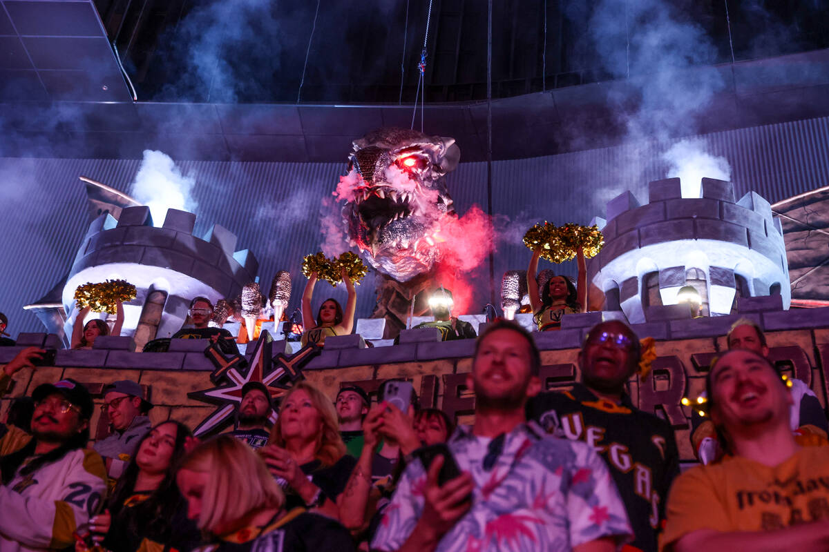 The dragon features a detailed, 3D-printed head and claws. The team commissioned the piece through Las Vegas fabrication-construction company Water FX, which developed Elvis the Helmet, the castle and the Stanley Cup Champions-banner slot machine featured at the beginning of the season.