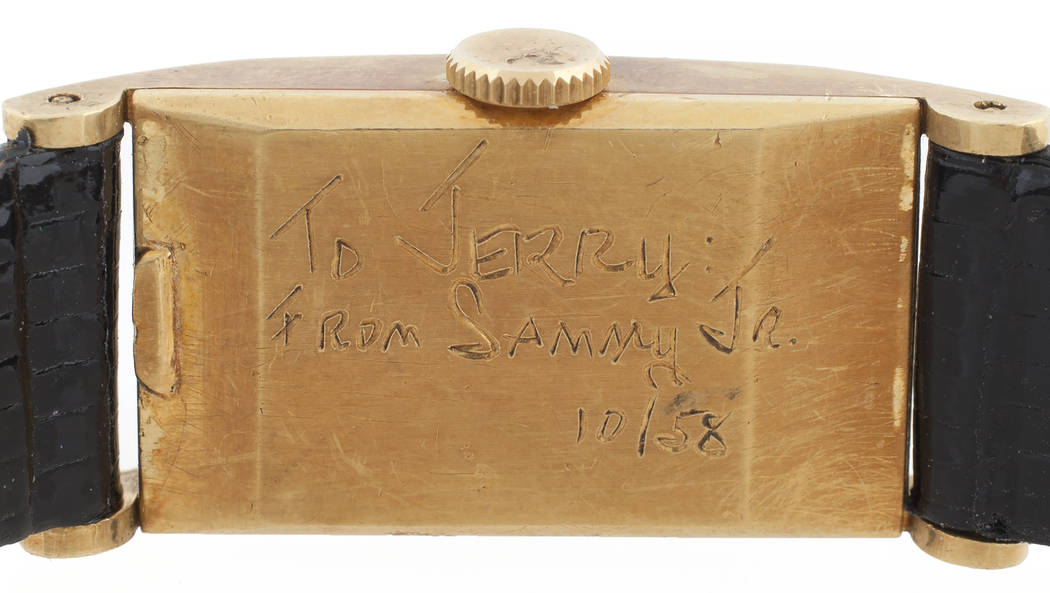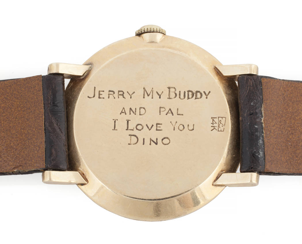 Among the items offered: A custom-made, tweed burgundy suit worn by Lewis in his Julius Kelp character in “The Nutty Professor”; three vintage black eyeglass frames, including reading glasses in the style Lewis wears in the film, with painted eyeballs on the lenses; a collection of Lewis’ watches, including an 18-karat yellow-gold Patek Philippe given to Lewis by Sammy Davis, Jr. and engraved on the back “To Jerry From Sammy Jr.”; a 14-karat yellow-gold Le Coultre watch given to him by Dean Martin and inscribed “Jerry My Buddy/ and Pal/ I Love You/ Dino”; and a 14-karat yellow-gold lighter with a relief caricature of Lewis in clown make-up.