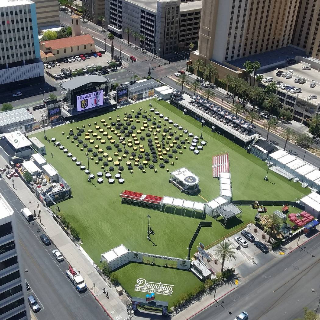 Aerial shots of Downtown Las Vegas Events Center’s official Golden Knights viewing party on Saturday showed the seats and tables in the VGK logo. That work was headed up by Blake Victor, a top Vegas graphics designer and the son The D Las Vegas Las Vegas Vice President of Operations Jeff Victor, who oversees events at DLVEC. Blake developed the pattern with 3D graphics, to scale, and the on-site crew followed his design.