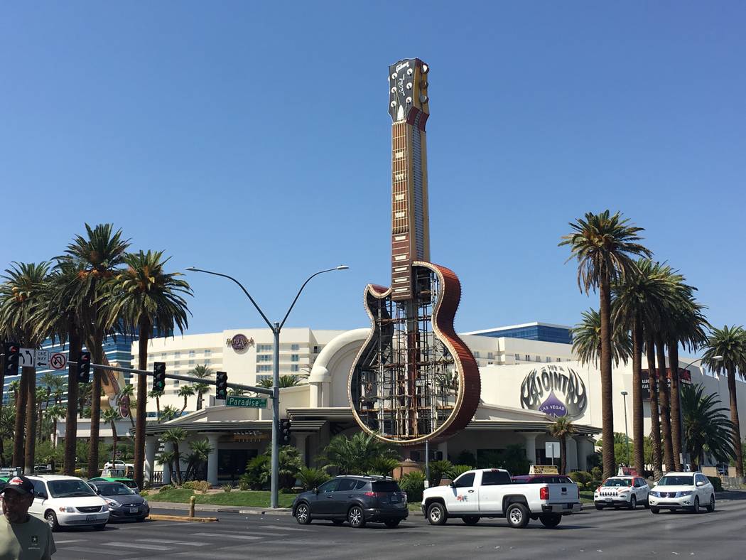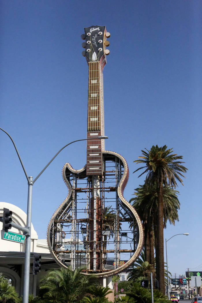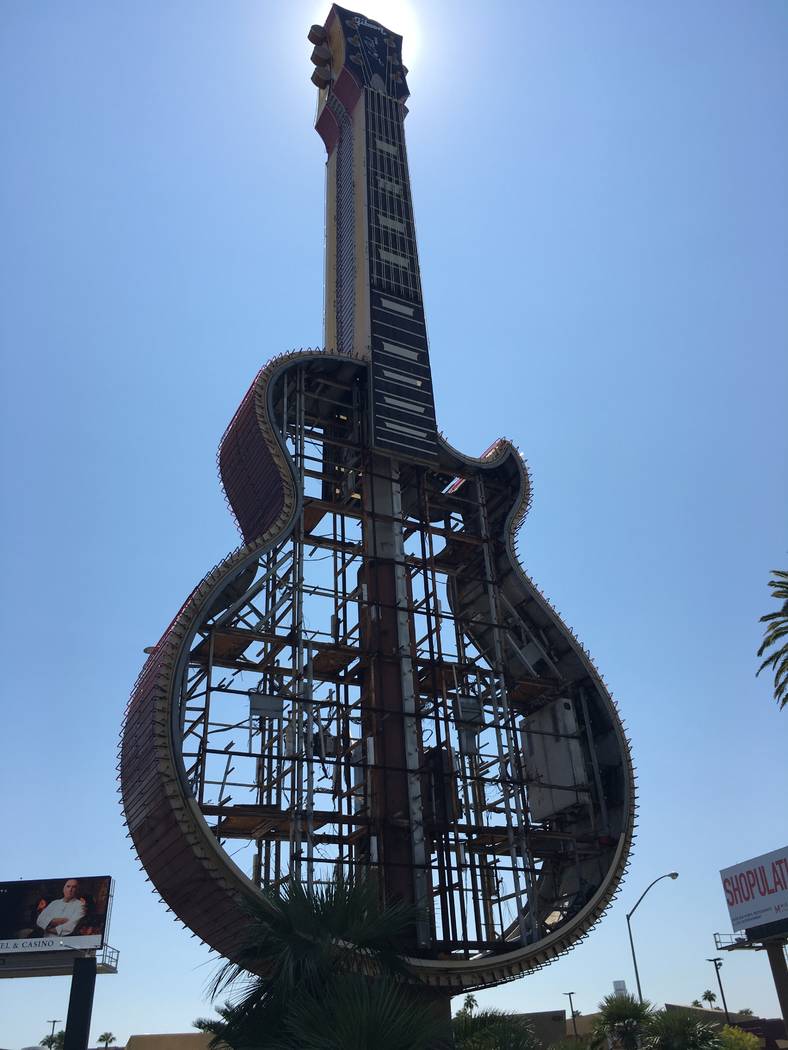 As Hard Rock Hotel chief operating officer Jody Lake said this afternoon his company attempted to purchase the sign from Yesco for $1 as Hard Rock Cafe closed, but a deal was never formalized. Under that agreement, the hotel would have assumed any renovation, refurbishment or transportation costs from the sign (one of Lake’s ideas was to tilt the sign on its side, appearing as if it was being played, for the trip to the Neon Museum).