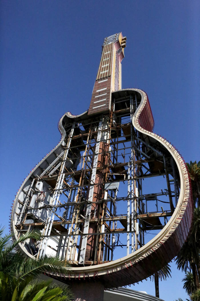 The city’s most famous 80-foot-tall guitar is headed for Neon Museum, to be displayed in January along with the dozens of other historic, decommissioned signs. Officials with the Neon Museum confirmed today the sign is being delivered to the attraction, but with no time line is set for its transport.