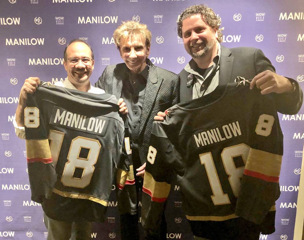 Westgate Las Vegas President Geno Iafrate and hotel sports book director Jay Kornegay presented Manilow and his manager/partner, Garry Kief, with a pair of Golden Knights jerseys after Thursday’s show. No. 18, for the year, with “MANILOW” stitched across the back. No word on whether Manilow will slip into one of those pieces amid his many costume changes.