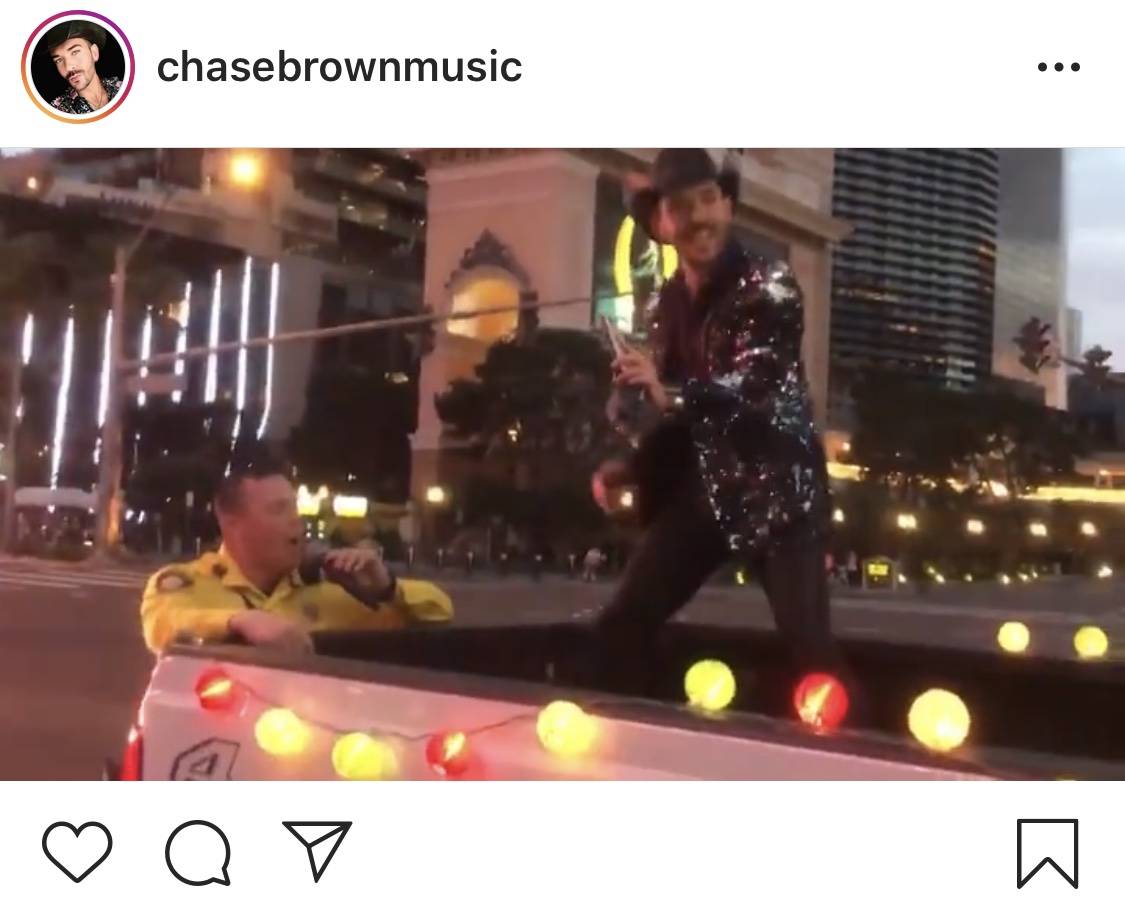 Las Vegas country singer Chase Brown put on a show for his Facebook followers on the Strip on Sunday night. Packing a microphone and the tracks to more than 100 songs, Brown started at the “Welcome to Fabulous Las Vegas” sign and headed northbound while standing in the bed of a pickup equipped with a sound system and strung with colored lights.