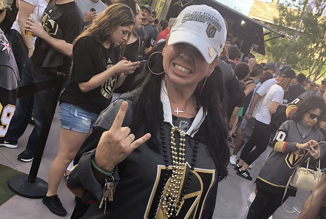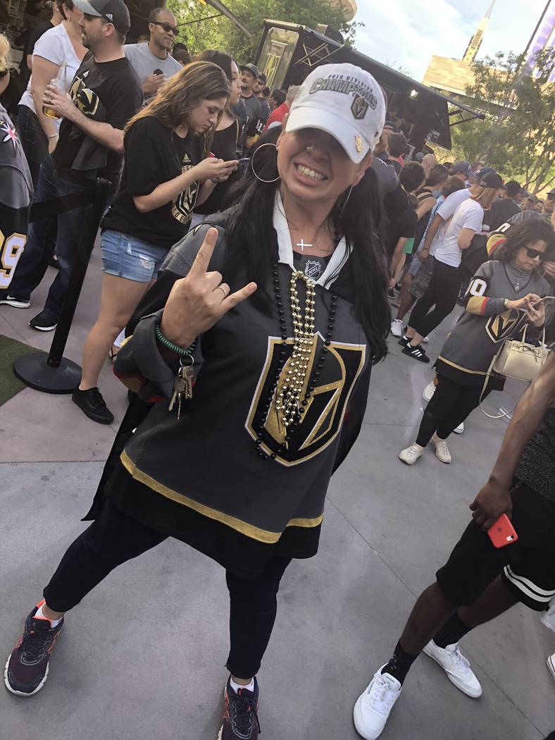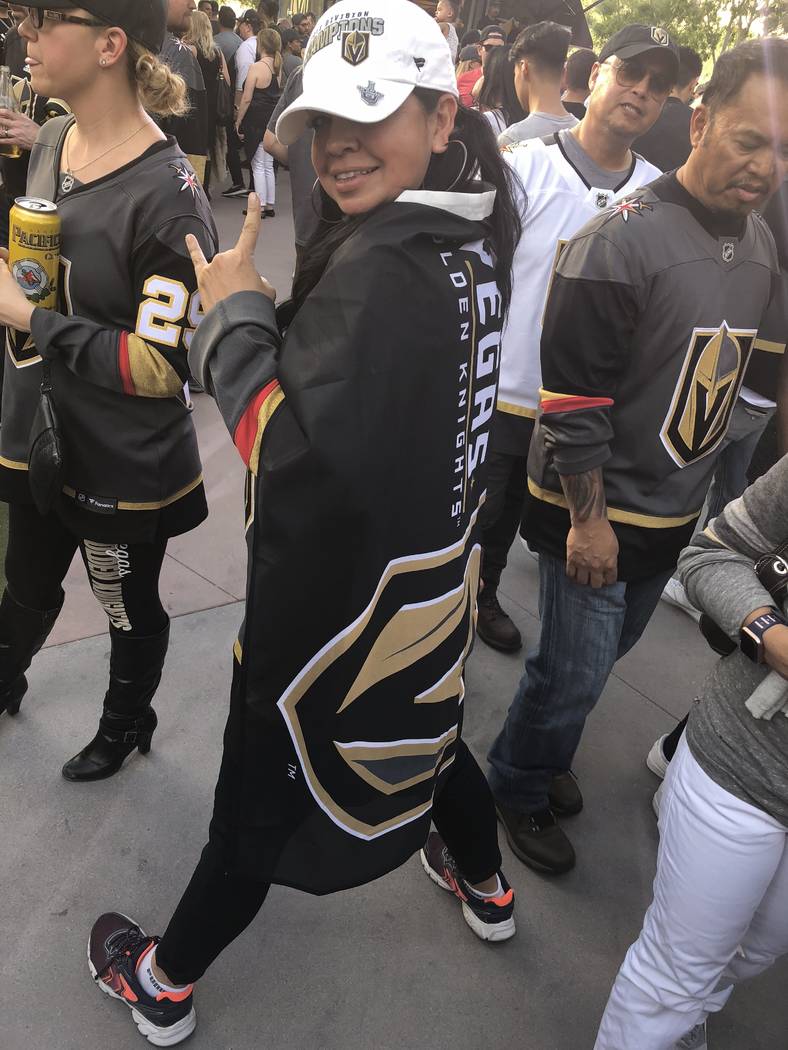 These days, in her role booking entertainment at Brooklyn Bridge, Nine Fine Irishman and the Bar at Time Square, Sanchez sports smart business suits and blazers with her name tag attached. Tonight, Sanchez wore a different uniform: A steel-grey Vegas Golden Knights jersey, white VGK ball cap, gold beads and — yes — a cape.
