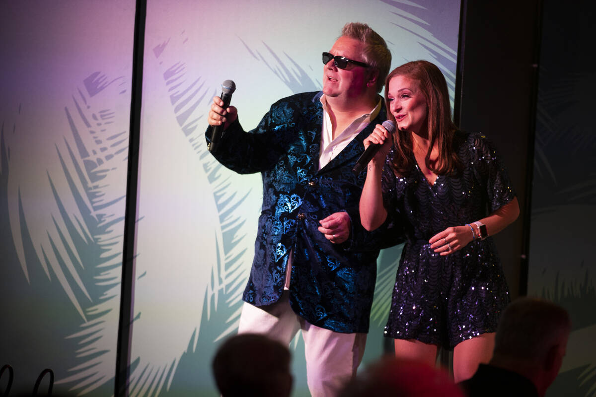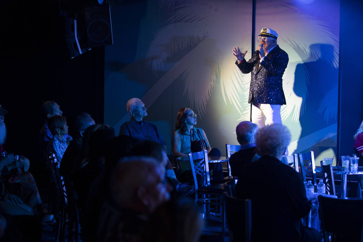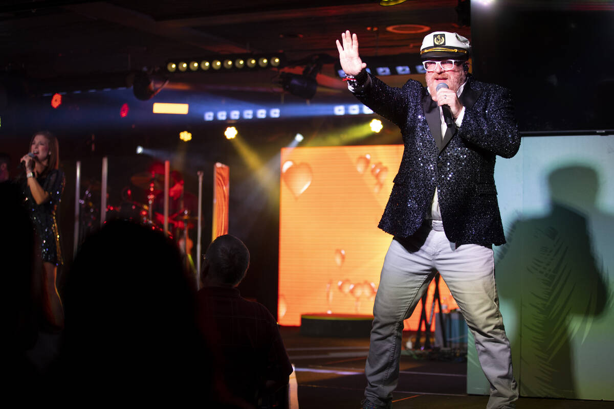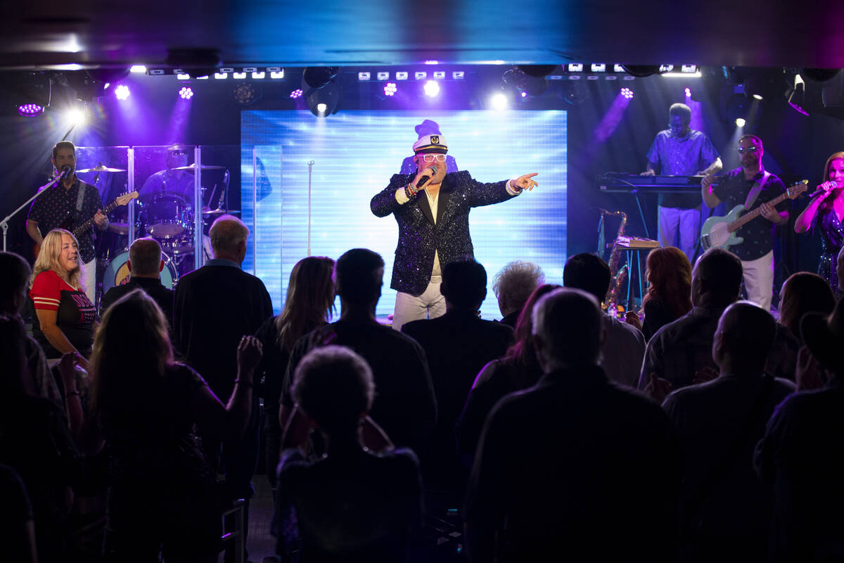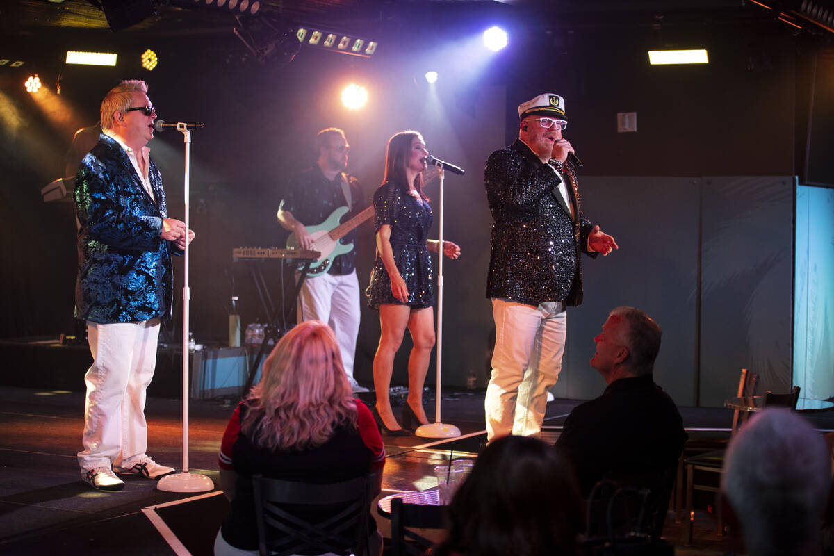 The Docksiders don Vegas-inspired, sequined blue boat jackets, captain’s hats and white slacks. Videos of the songs in their set list play at the back of the stage and on the monitors on either side.