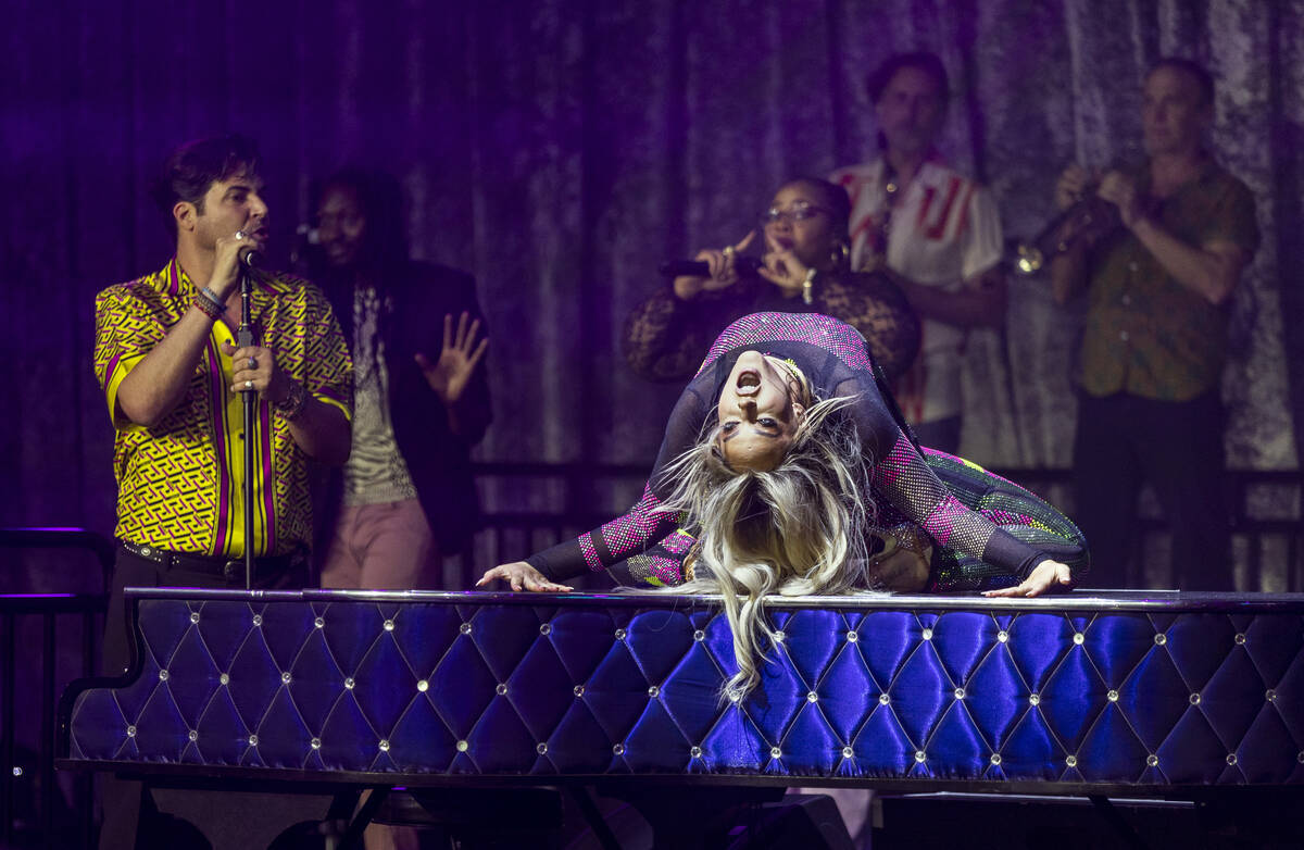 Moreno’s band for the Kaos run is his brother Tony on bass; Mundo Keali’i on lead guitar, Don Meoli on drums; the horn section of Pete Bresciani (trumpet and also the occasional banjo), James D’Arrigo (sax) and Diego Morales (sax). Dre Young and Ashley Kellough are the dedicated backing singers. Moreno’s girlfriend, pro dancer Lacey Schwimmer, danced atop the piano to “Diva.”