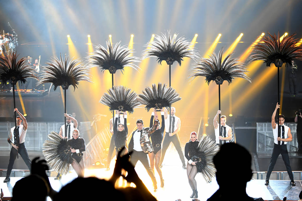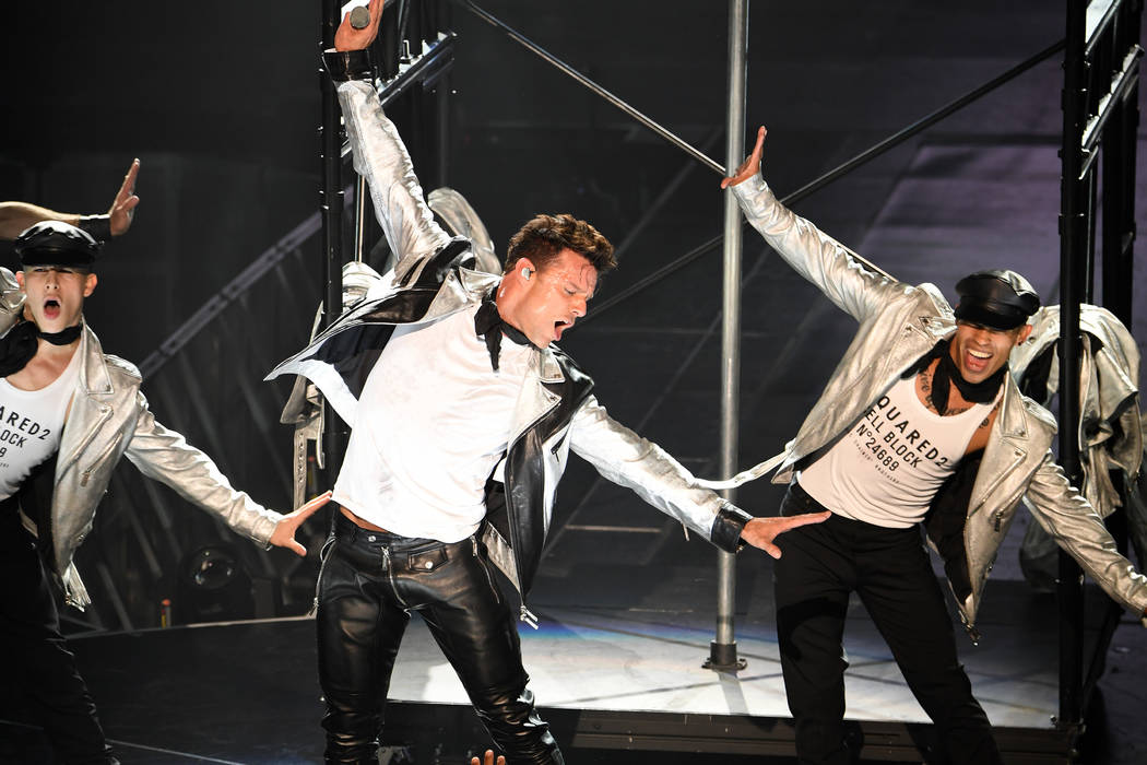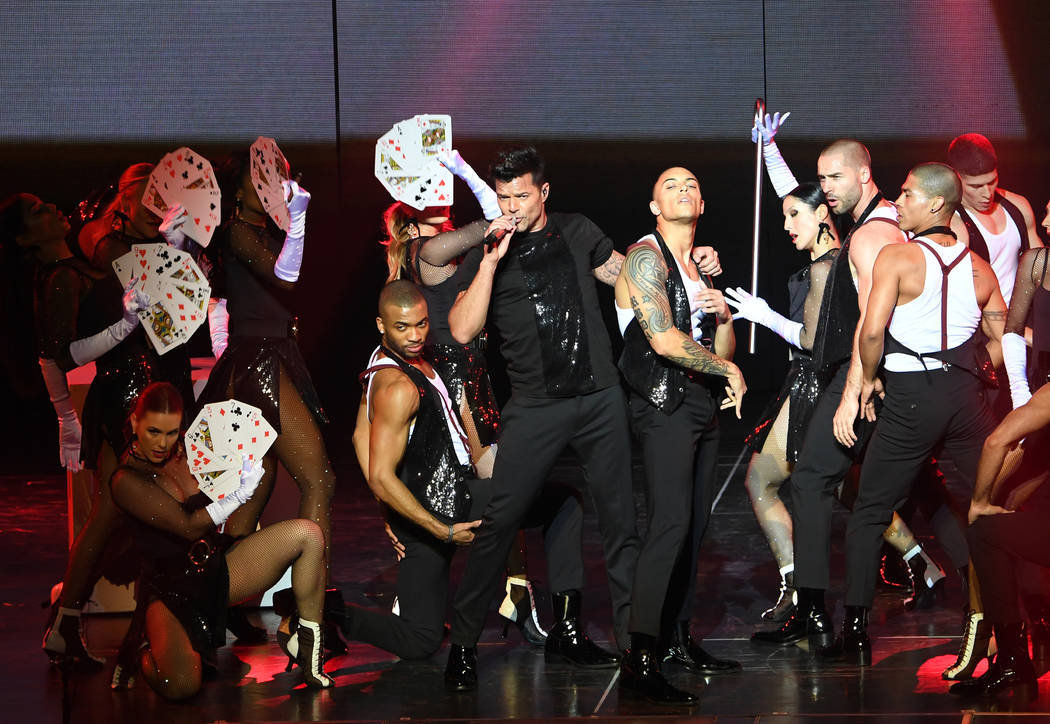 Martin evokes familiar Vegas images with new technology, the LED screens lit up with dice and the Welcome to Fabulous Las Vegas sign. Grooving through “Shake Your Bon Bon, “Cup of Life,” “She Bangs” (which is not always true), Martin summons some Elvis-inspired moves and stages a segment that reminds of “Jailhouse Rock.”