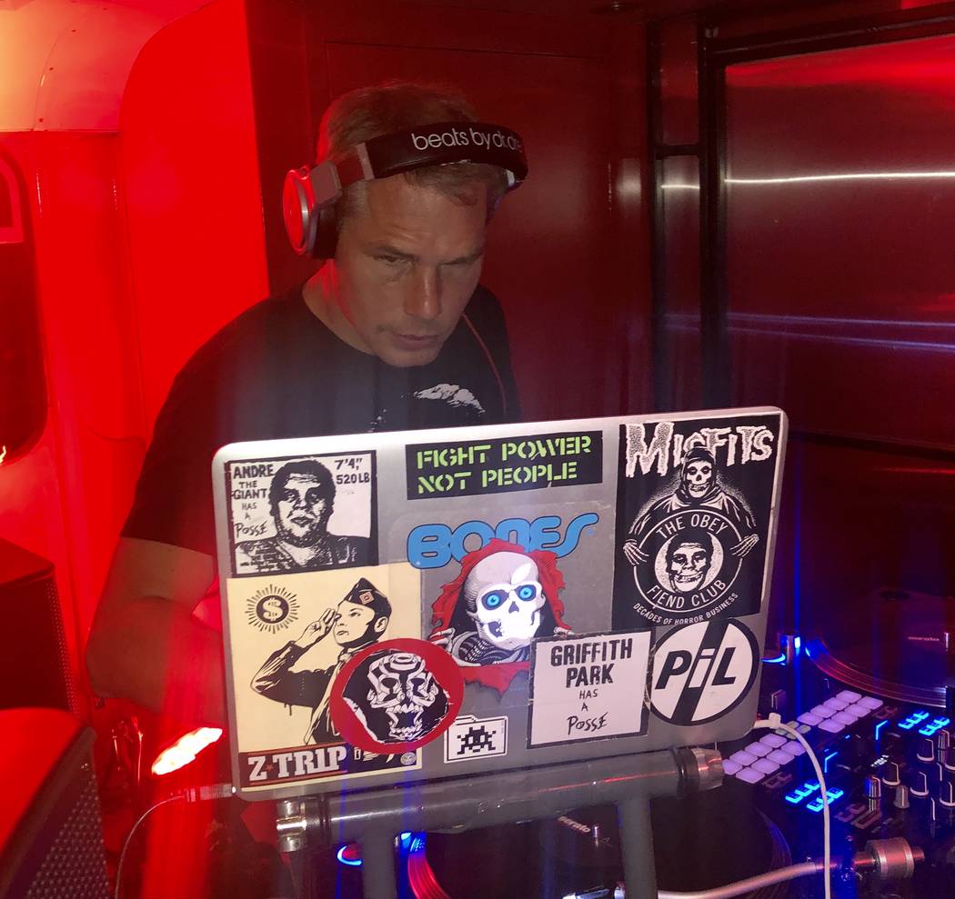 Fairey’s work is featured in such revered museums as collections as the Smithsonian, the Los Angeles County Museum of Art, and the Museum of Modern Art in New York City. The 49-year-old artist is also a serious DJ. He would take the booth on the lower level of the bus for a late-night spin.