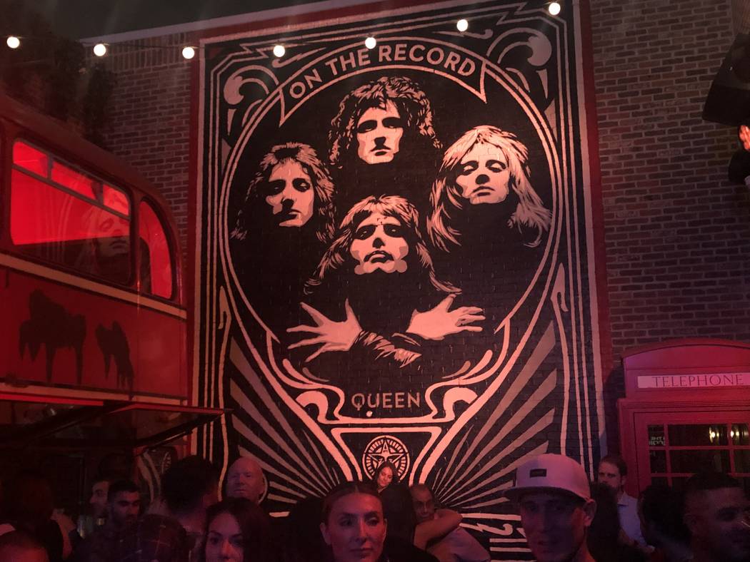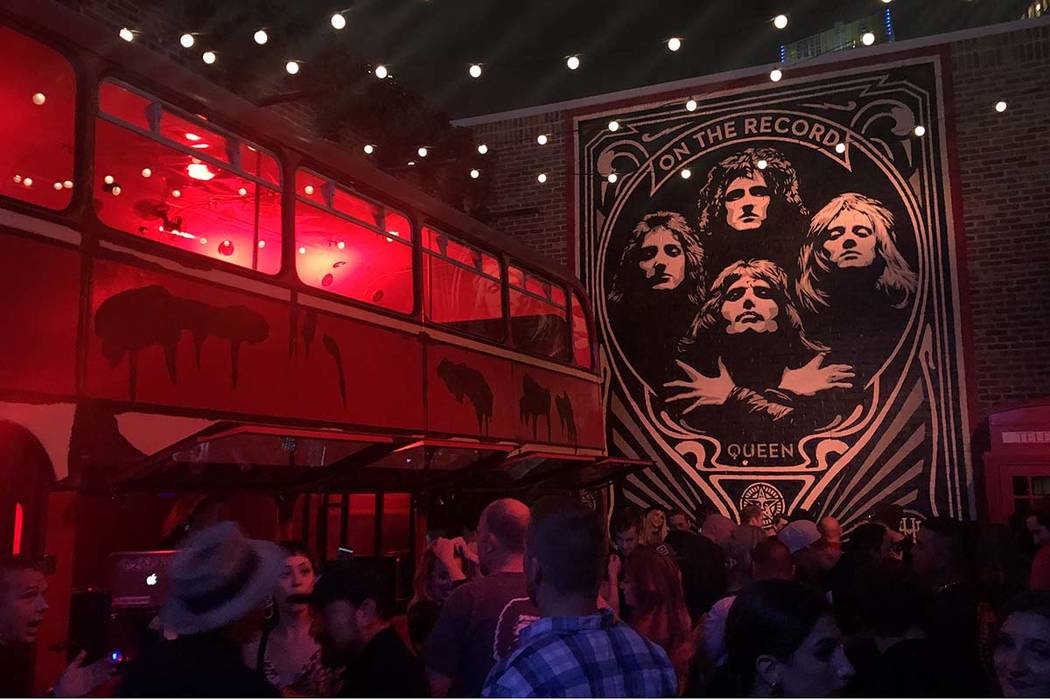 Fittingly, Fairey himself was up there, on the top level of the ‘63 Bristol Lodekka double-decker bus that doubles as a DJ booth at OTR’s open courtyard. The Wednesday night party was an unveiling of Fairey’s latest piece, a black-and-white portrait of Queen against the brick wall overlooking OTR’s upper-level courtyard.