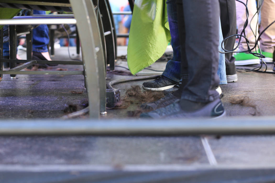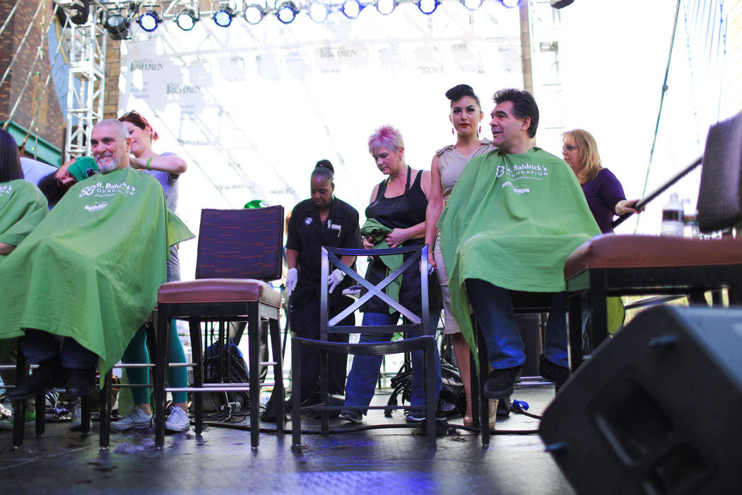 Vegas performers filed to the stage throughout the day at “NFI,” which is the shorthand term for Nine Fine Irishmen. The lineup of shavers included Mirage headliner Terry Fator, the cast of “Magic Mike Live” at Hard Rock Hotel (opening March 30), “Fantasy” at Luxor, “Thunder From Down Under” at Excalibur; skaters Emily and Billy England of “Absinthe,” members of “Chippendales” at the Rio; the cast of “Baz – Star Crossed Love” at Palazzo Theater; New York-New York’s Coyote Ugly Girls, the Tenors of Rock at Harrah’s; Clint Holmes and Kelly Clinton-Holmes; and members of the “Zumanity” cast at NY-NY.
