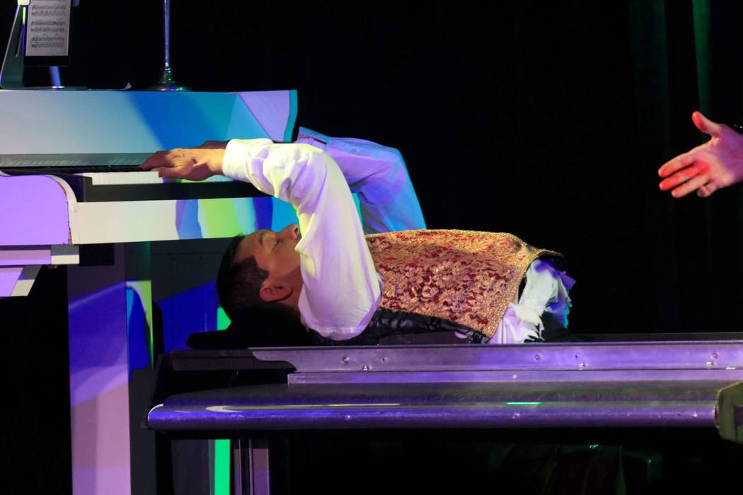 The new production is very similar to the one the duo performed at Hooters, but many of the acts are more effective with the expanded space. For example, the moment where Raja, a Juilliard-trained pianist, hovers above the piano as he plays “Blue Danube.” He finishes the piece by touching the keys with his feet. This works beyond the level of staged illusion.