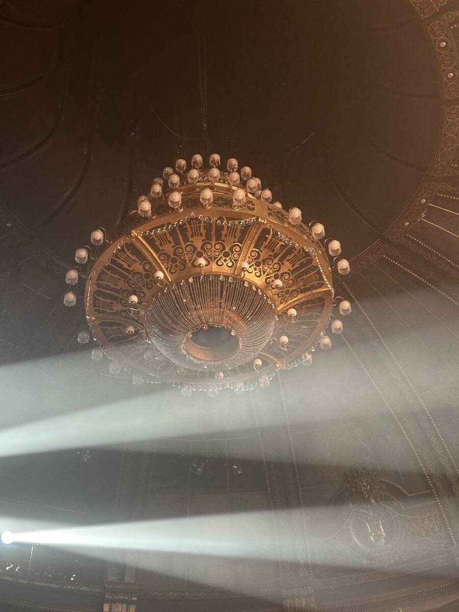 Closing the first act in a major theatrical moment, the chandelier dropped 5 feet, to gain the audience’s attention. Then it fell 35 feet — at 18 feet per second — halting just a few feet from those seated in the middle section. The stage went black as the piece fell.