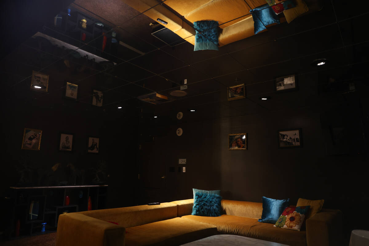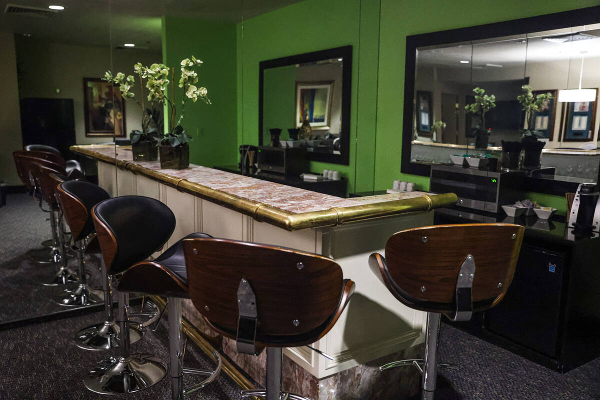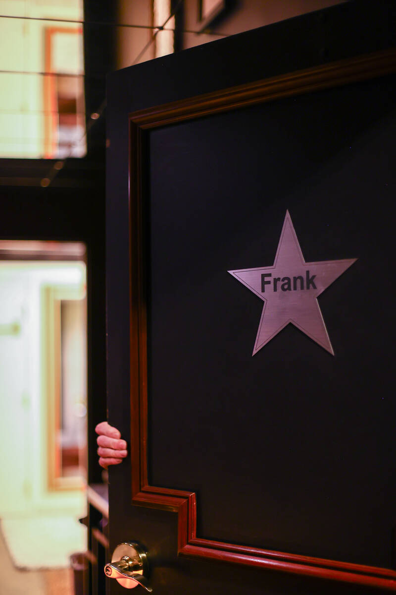 The “Frank” star on the dressing room door, the mirrors on the ceiling, marble table and leather furniture are all original from the Ol’ Blue Eyes era. He had seen the leather pieces on a tour of Europe and ordered them delivered.
