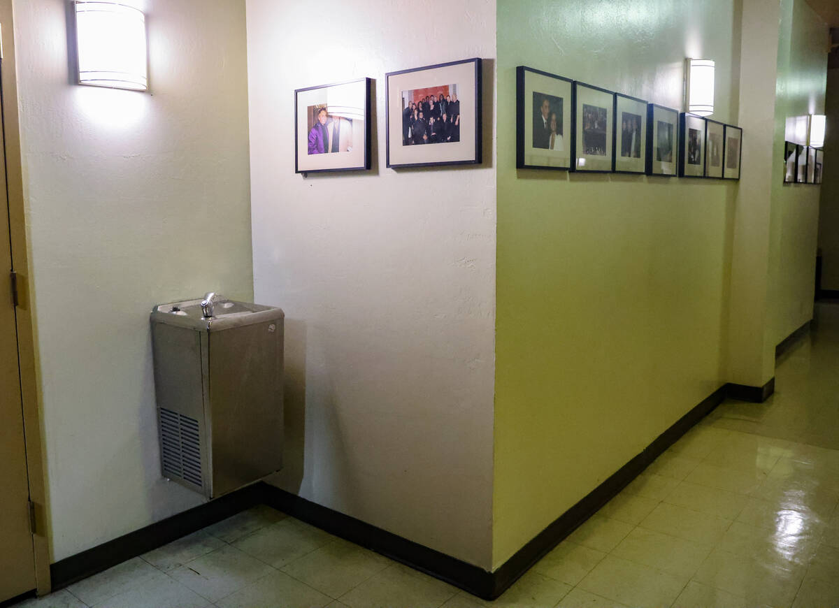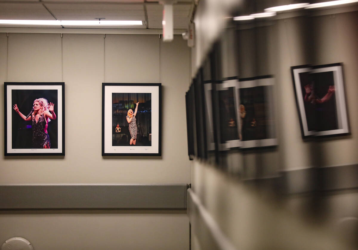 Smith Center President Myron Martin’s framed pics adorn the backstage walkway at Myron’s cabaret room, dating to the venue’s launch a dozen years ago.