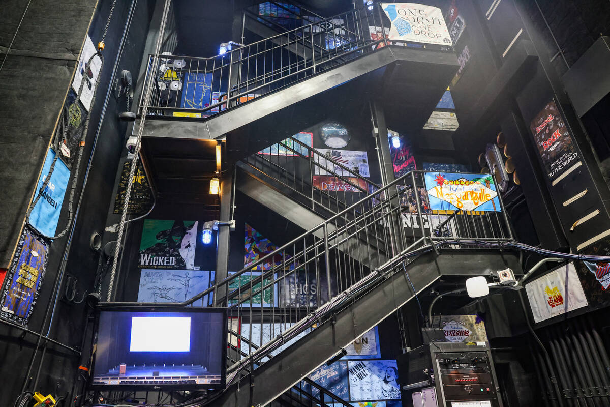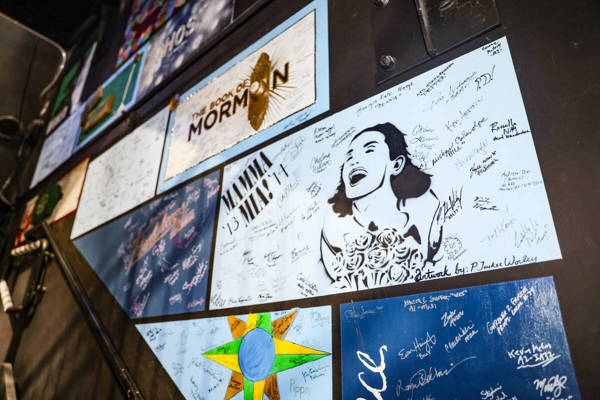Lily Tomlin, Steve Martin, Natalie Merchant, Paul Anka, Dave Koz, Gordon Lightfoot, Jerry Lewis, Willie Nelson and George Thorogood occupy one coincidentally iconic area. “Mayor Carolyn Goodman and Oscar” reads one signature, near that of veteran rock promoter Danny Zelisko. “One Night for One Drop,” “Escape to Margaritaville,” “Newsies” and “School of Rock” are some of the many shows to leave banners behind. The lantern from “Hamilton” hangs in the space.