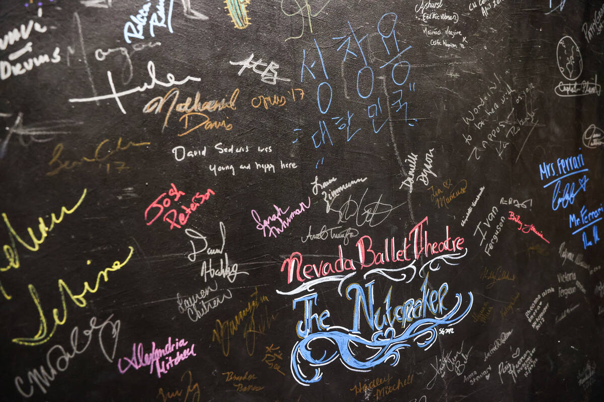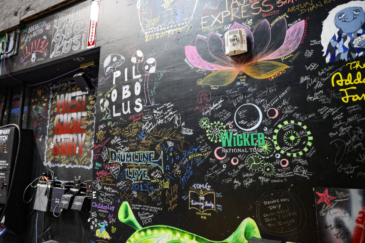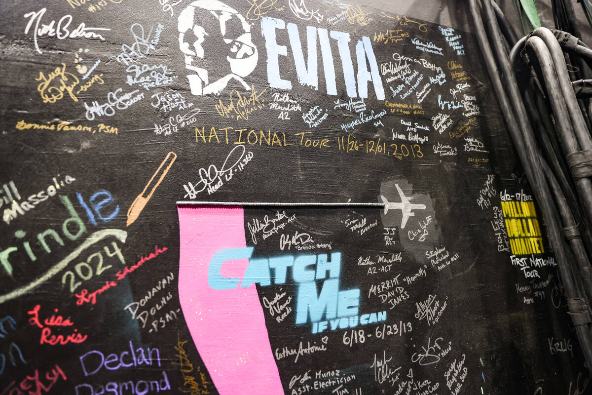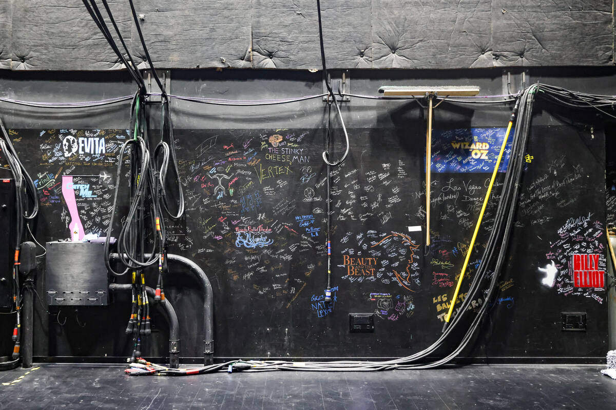 The touring cast of “Les Miserables” were the first performers to tag the stage-right wall at Reynolds Hall in 2013. Since then, hundreds of headliners and cast members from Broadway shows have marked the walls. The signatures, hand-crafted logos and banners stretch nearly to the back of the stage, all the way to the theater’s third level and even to the doors facing the hallways outside the theater.