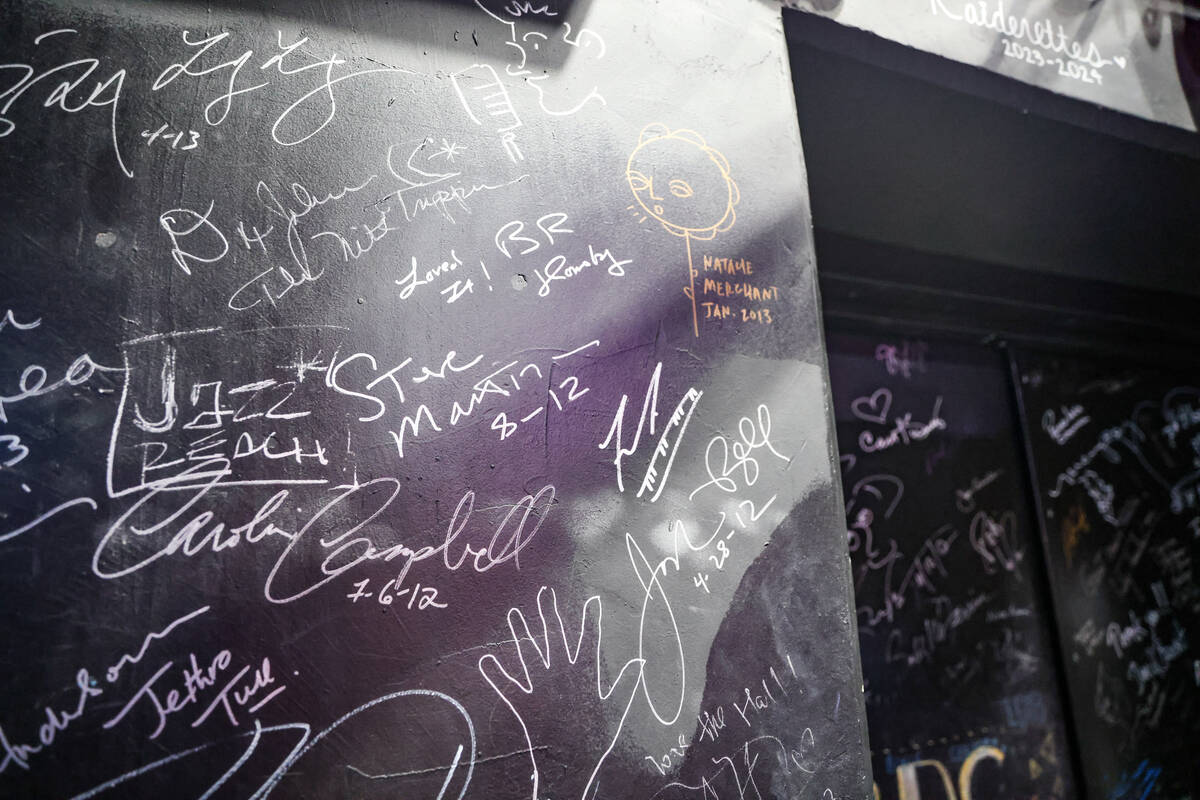 The extensive and evolving signatures and tags from headliners and productions at Reynolds Hall dominate the walls just off stage right, unbeknownst to ticket holders. The theater’s backstage hallway is decorated with photos from the hall’s opening night in 2012.