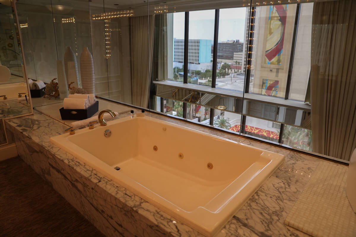 The 1,250-square-foot suite is still rented as a guest room for $650 to $750 per night, escalating according to demand. Many ’80s design effects (such as a push-button phone and silver-beaded curtains) remain. Don Rickles was the most recent celeb to use the suite as his dressing room and private quarters, for his final shows at the hotel in October 2007.