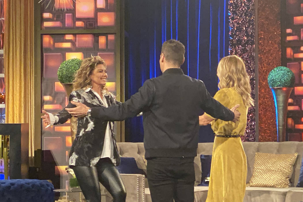 Seated on a sofa across from Twain, Seacrest opened the dialogue with, “So many people have residencies here, and work here all the time, and we have Carrot Top coming on the show. I picture all of you guys getting together and having tea …”