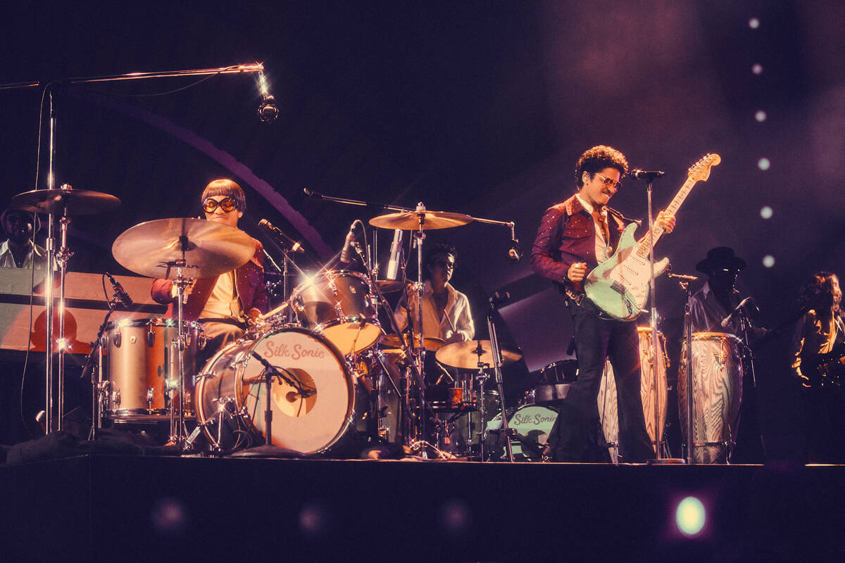 The stage set, emblazoned with giant multicolored stars, streaks of neon and rainbows, is staggering. So is the choreography from Mars, .Paak and the four-man lineup that takes up the front of the show. The dance moves, which copy from the Spinners and Pips, are intricate, tight, and demonstrated throughout the night.