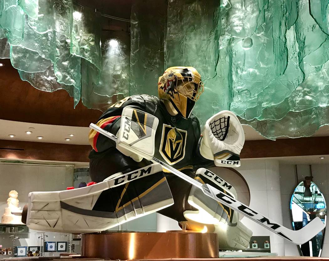 Elsewhere, a 5-foot-tall, chocolate Marc-Andre Fleury statue stands in front of Bellagio Patisserie. Work began on the figure Feb. 10 and was finished about two weeks ago. The figure is almost entirely edible, but for a Styrofoam frame, and loaded with 90 pounds of chocolate (milk, dark and white) and 20 pounds of Rice Krispies.