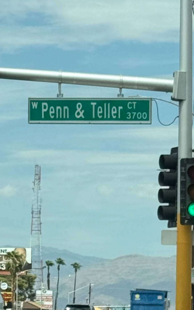 On Thursday, the day they sold out Radio City Music Hall in New York, Penn & Teller were honored near the Rio with their long-overdue street sign. Penn & Teller Court is on Viking Road, leading into the hotel.