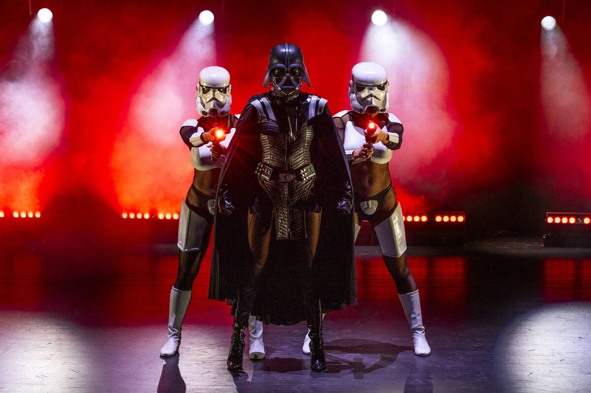 Cast members dress in iconic “Star Wars” costumes, true to their original characters, but customized to show some skin and allow for dancing. Most of the roles played by guys in the films are taken by ladies in the satire show.