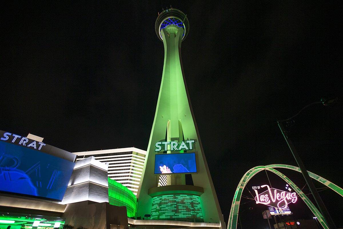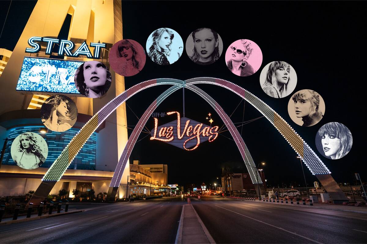 The LED-infused structure on Las Vegas Boulevard at The Strat will be lit to reflect the colors of Swift’s albums. The series begins Wednesday night and runs through Saturday night, after the second of Swift’s two concerts at Allegiant Stadium.
