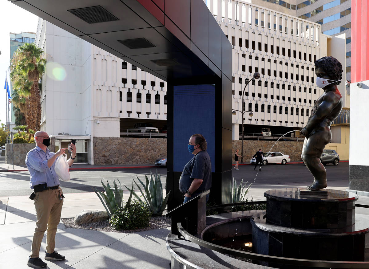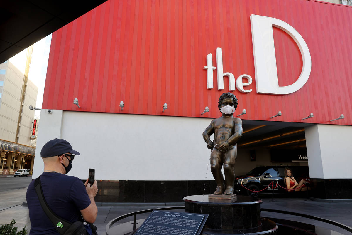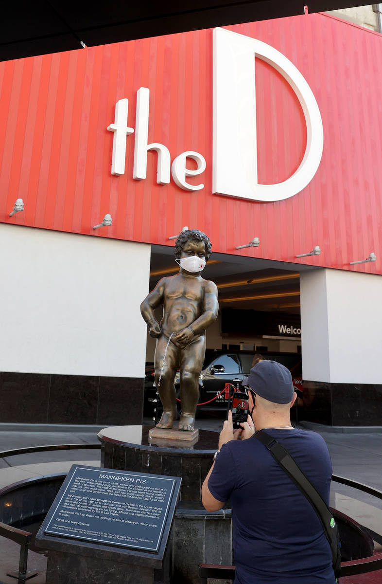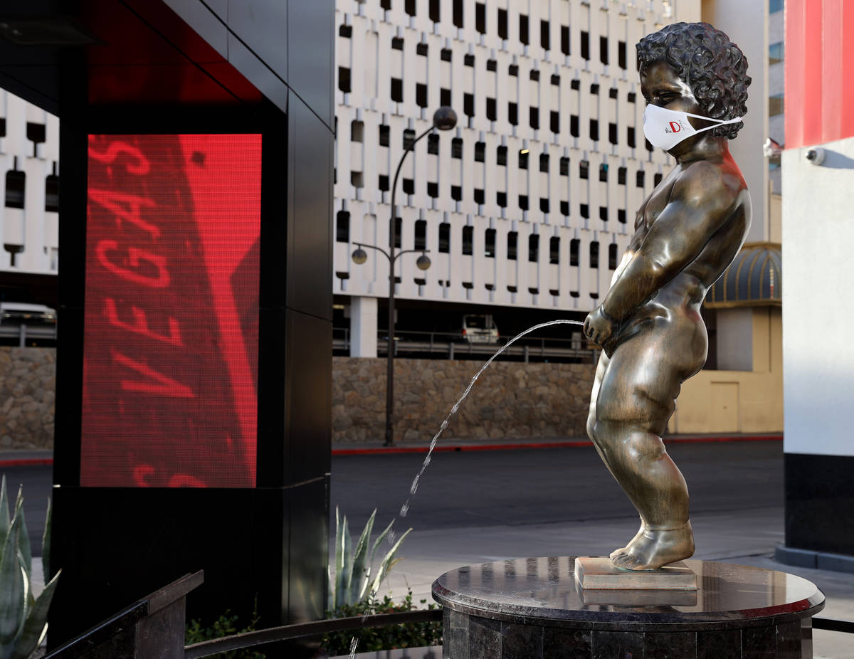 The cherubic, bronze statue at the P Las Vegas — wait, the D Las Vegas — is now wearing a face mask with the hotel’s logo. He is the latest figure to jump into the pool in the statewide “Mask Up for Nevada” campaign. Even Elvis, now a Las Vegas Raiders fan, is rocking a mask at Westgate Las Vegas.