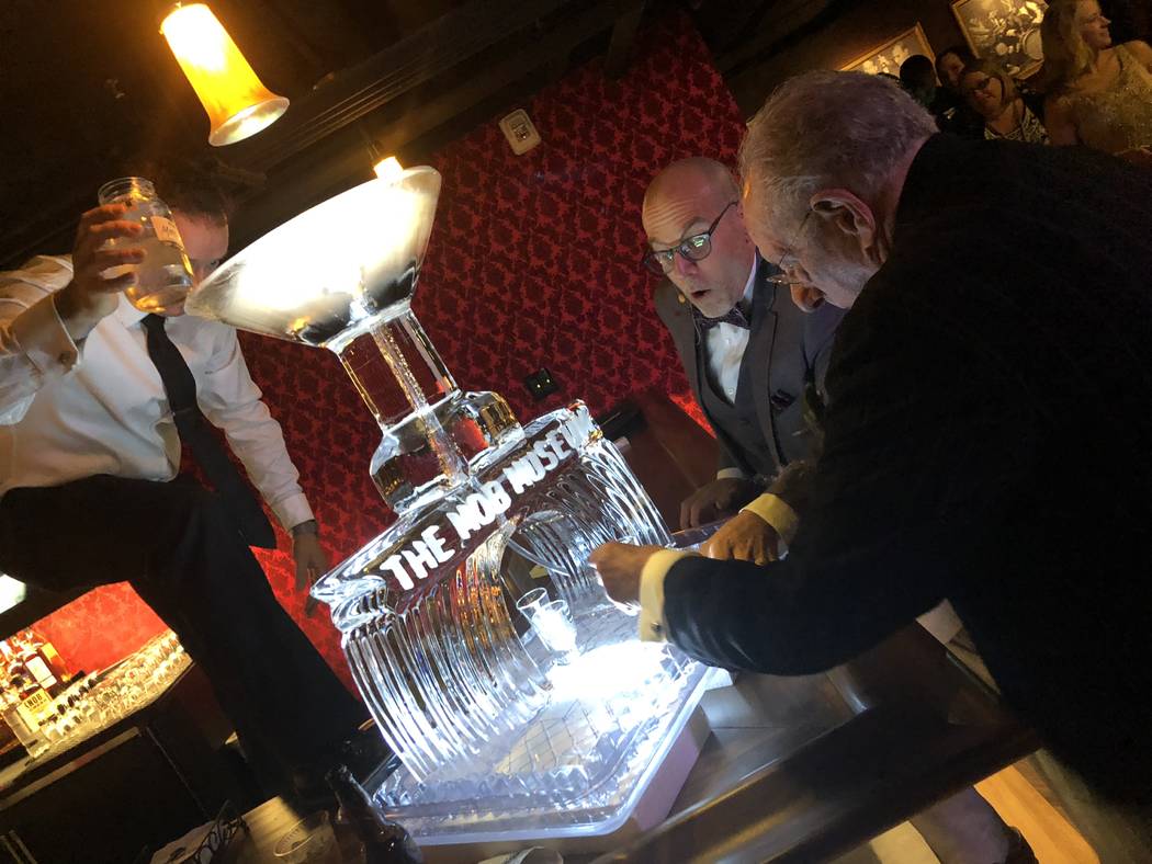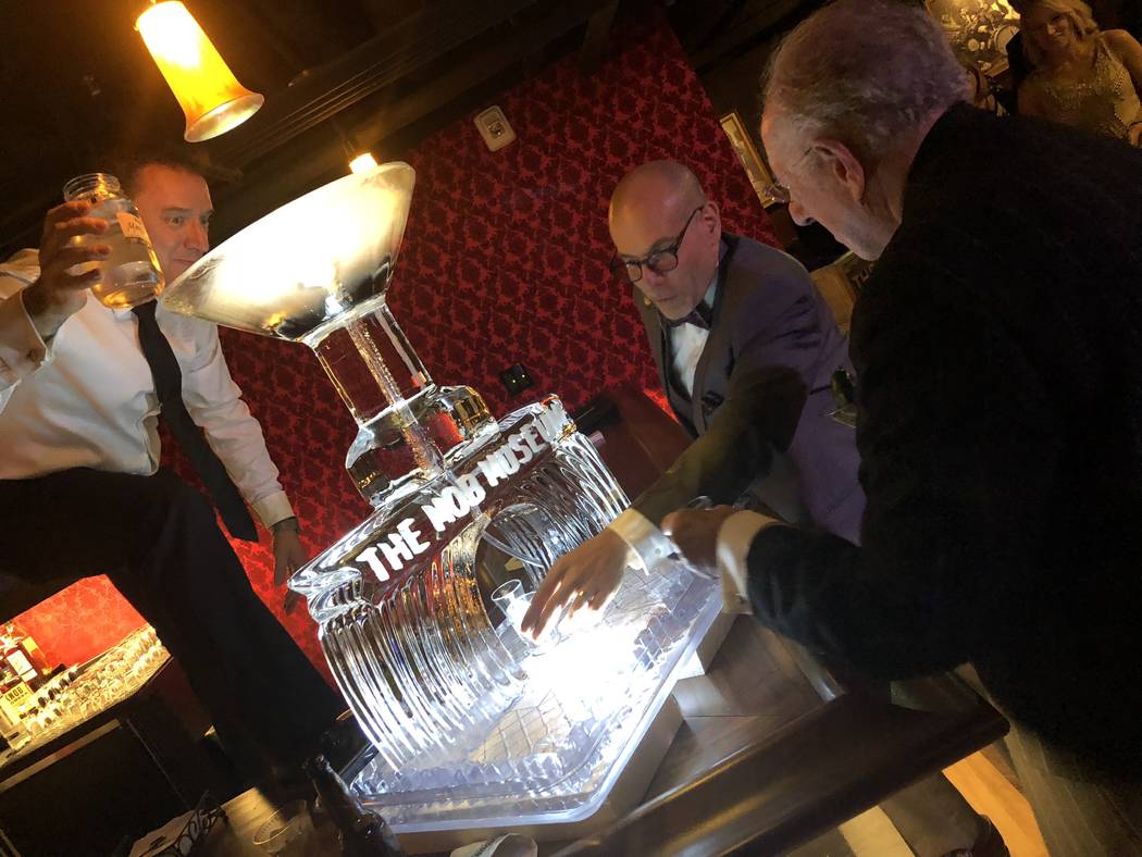 Former Las Vegas Mayor Oscar Goodman, who joined Mob Museum President and CEO Jonathan Ullman in a moonshine toast — actually pouring the hard liquor into his martini glass for “my new drink!” — is a consultant in the project.
