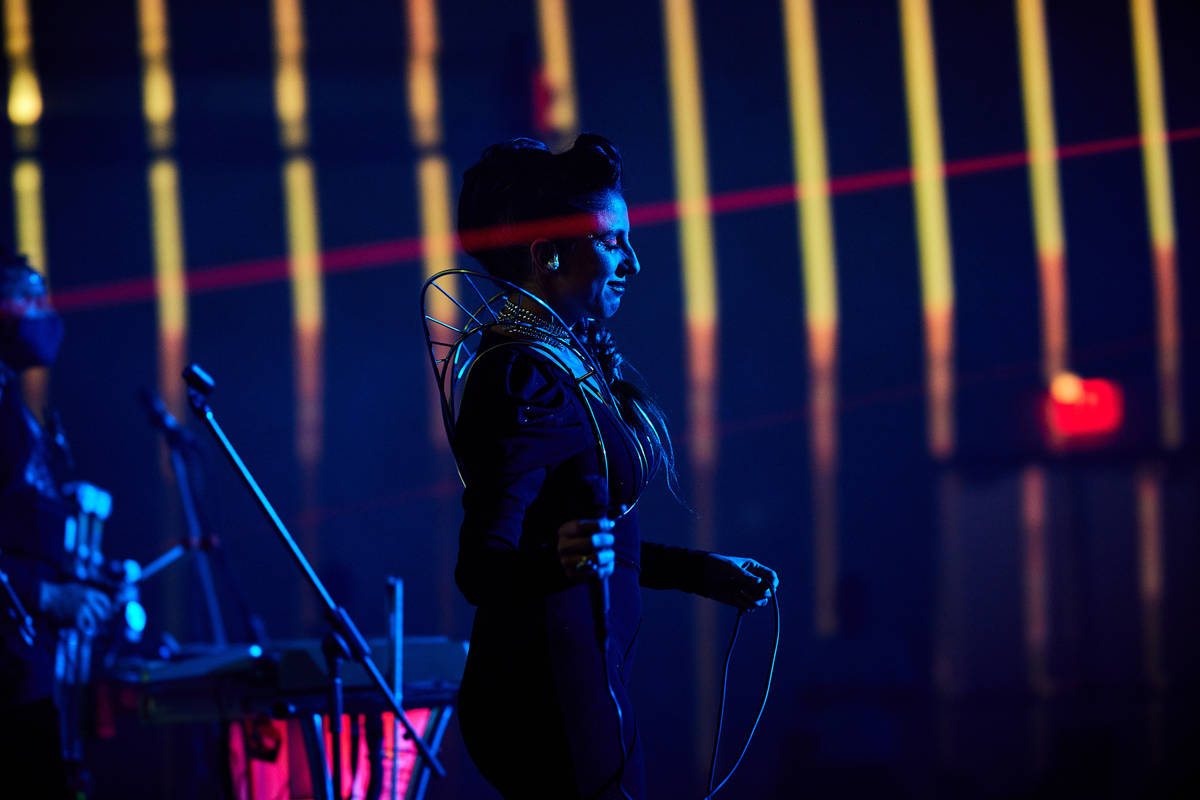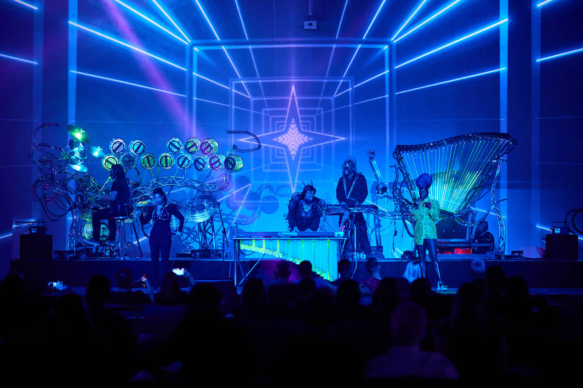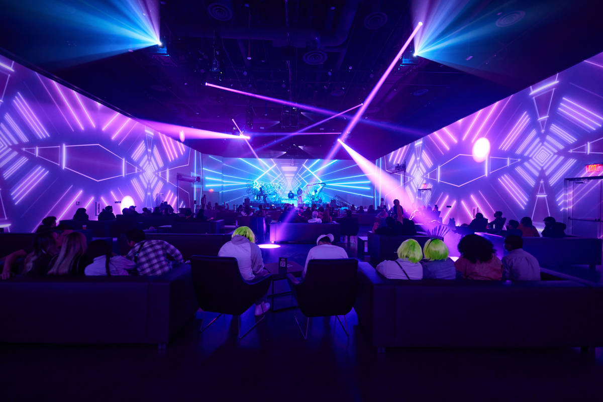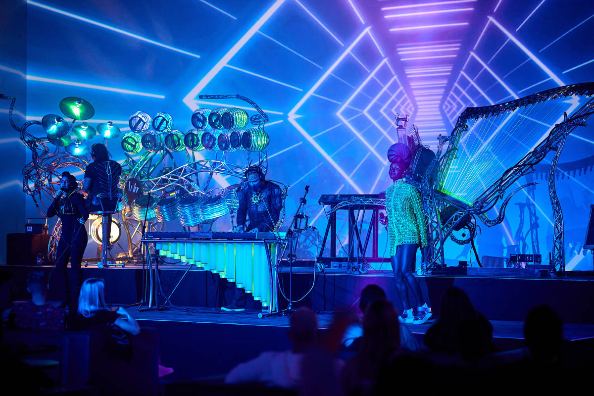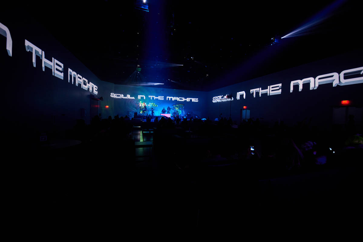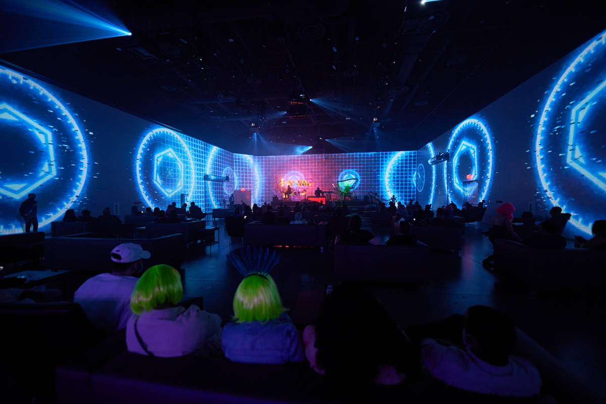 Chang mixed a band of artists known as Soul in the Machine with thumping EDM beats and flashing fluorescent light at the Portal at Area15 on Saturday night. The result was likely a residency for live music in the dizzying venue, where images are projected in 360 degrees, on every wall, the floor and ceiling.